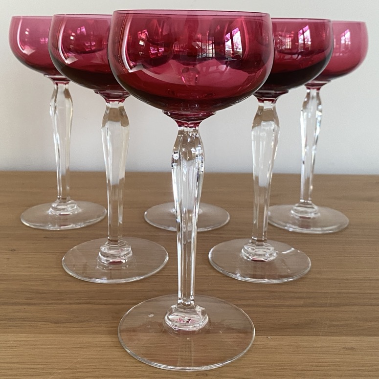 6 verres à vin (18 cm de haut) de couleur rouge, issus de la manufacture Val Saint Lambert, de la collection Saumur. Ils ne sont pas marqués.