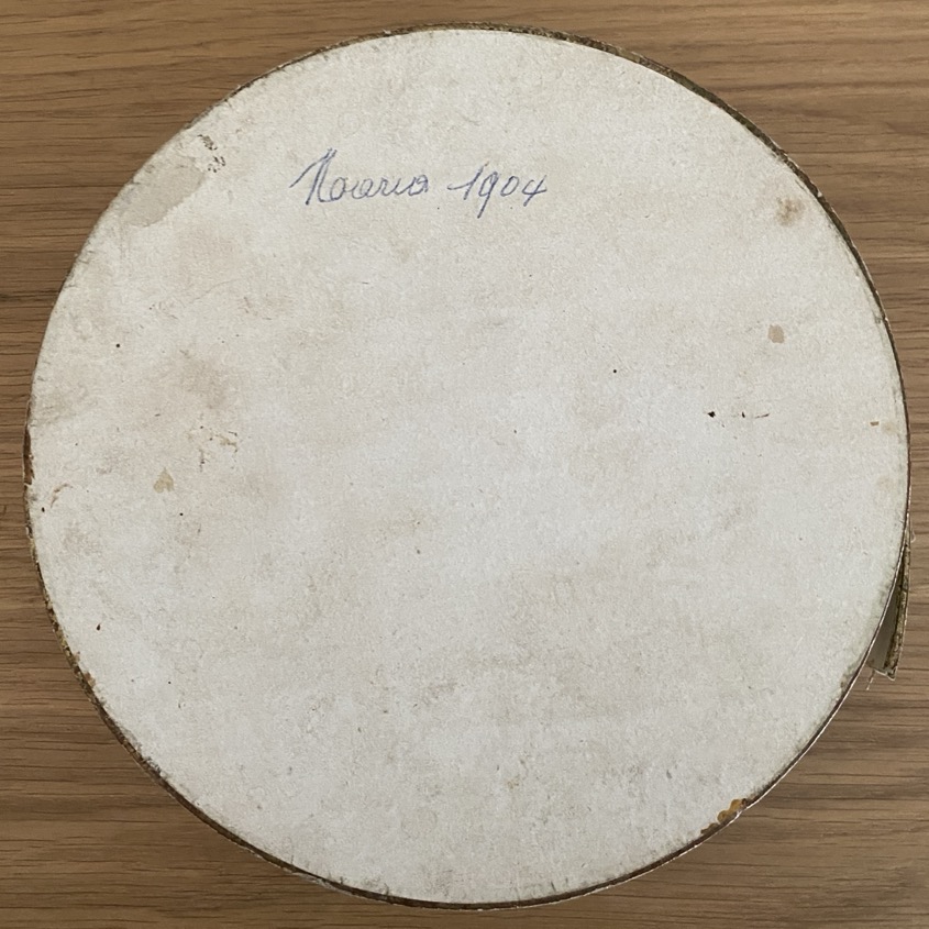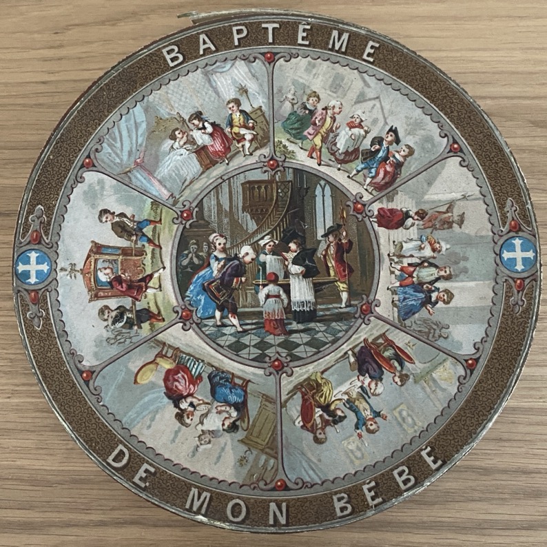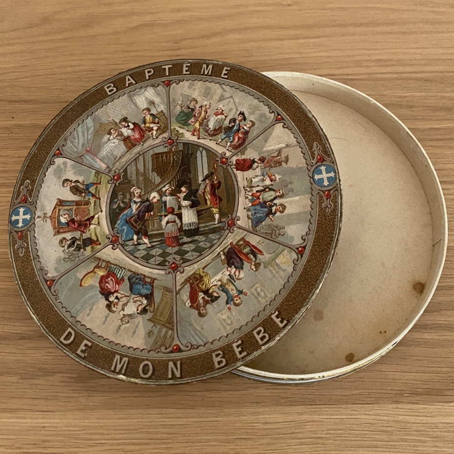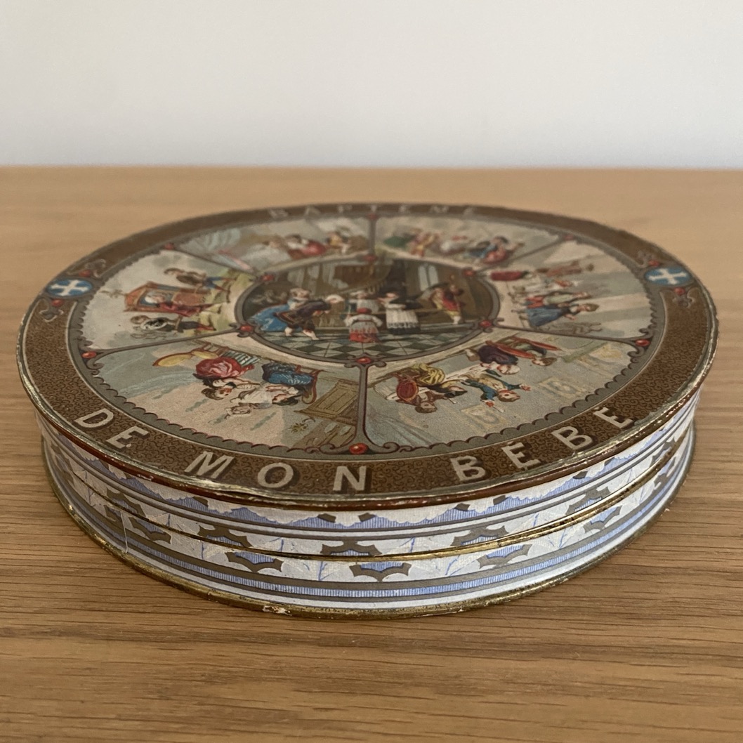 Belle boîte à dragées en carton (17 cm de diamètre) portant des scènes enfantines. Sous la boîte se trouve l’inscription manuelle « Maria 1904 ». Elle est en assez bon état pour son âge.