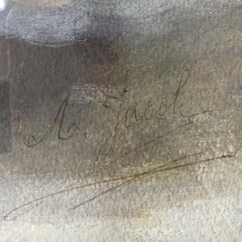 Grande peinture à l’huile (125×105 cm cadre compris) représentant un bouquet de lilas, signée en bas à droite A Jacob. Ce tableau est également contre-signé sur le cadre. Alexandrine Jacob est une artiste arlonaise qui très jeune, elle est attirée par la peinture et commence à peintre à 18 ans au Couvent des Chanoinesses. Elle suit des cours de l’Académie des Beaux-Arts de Bruxelles. Appréciée pour ses peintures de fleurs, on la surnomma trop souvent à son gré « le peintre des fleurs ». Elle aimait également les chevaux de labour, la moisson, la terre. Elle adorait travailler au couteau, en pleine pâte, dans des coloris somptueux. Elle était également une pastelliste de talent, d’une sensibilité délicate, et une portraitiste perspicace. Dès la fin des années 1940, elle peint également des marines qui, selon un article de 1950, « dépassent de loin ses tableaux de fleurs, avec des couleurs attrayantes et sures. Les paysages méditerranéens trouvent en elle une interprète sensible aux lumières et aux teintes éclatantes. Elle atteint ici la vérité picturale avec une pointe de romantisme qui a bien son charme. »