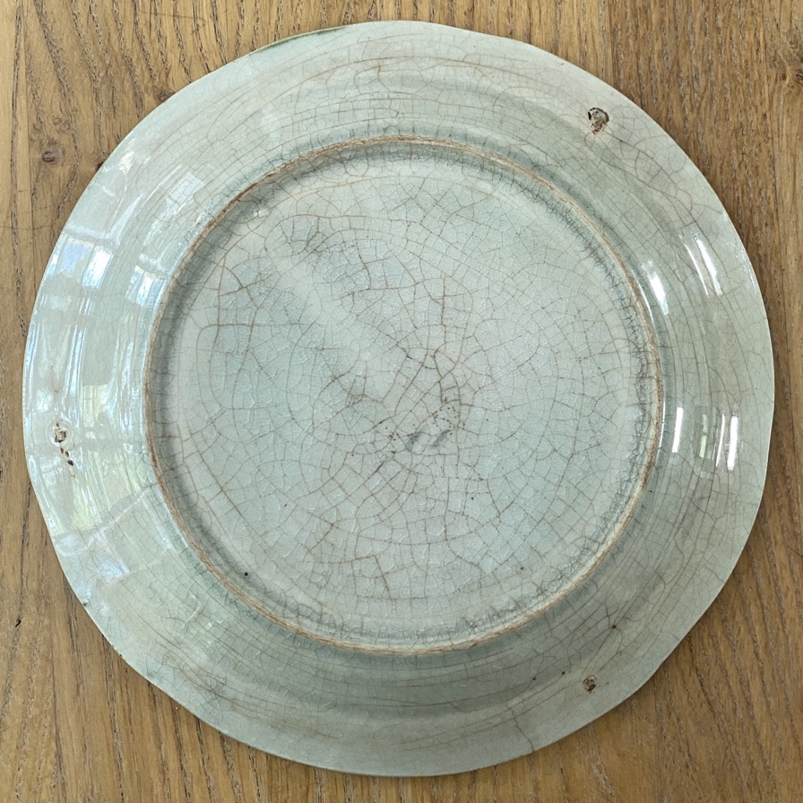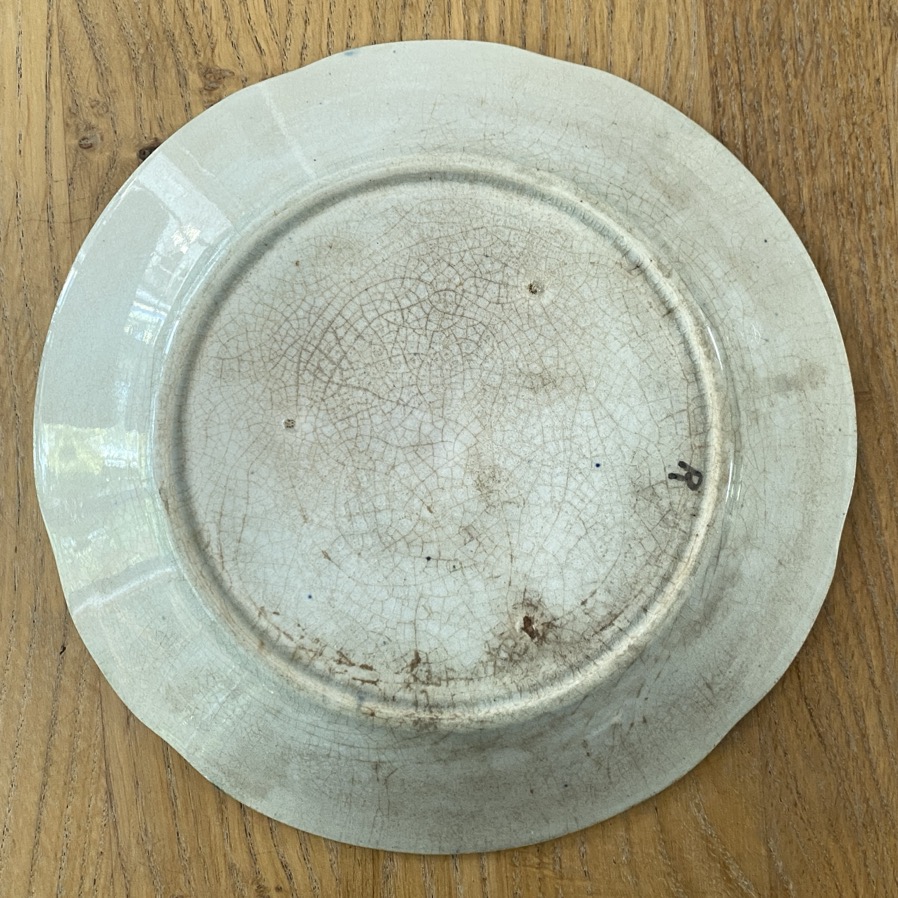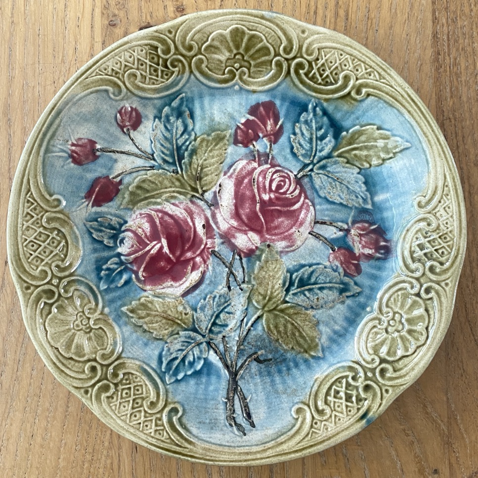 Assiette en barbotine  (21 cm de diamètre) avec une représentation de roses, issue de la faïencerie de Wasmuël (1834-1952) ou d’une faïencerie du nord de la France (à préciser). Cette assiette date de plus ou moins 1900.