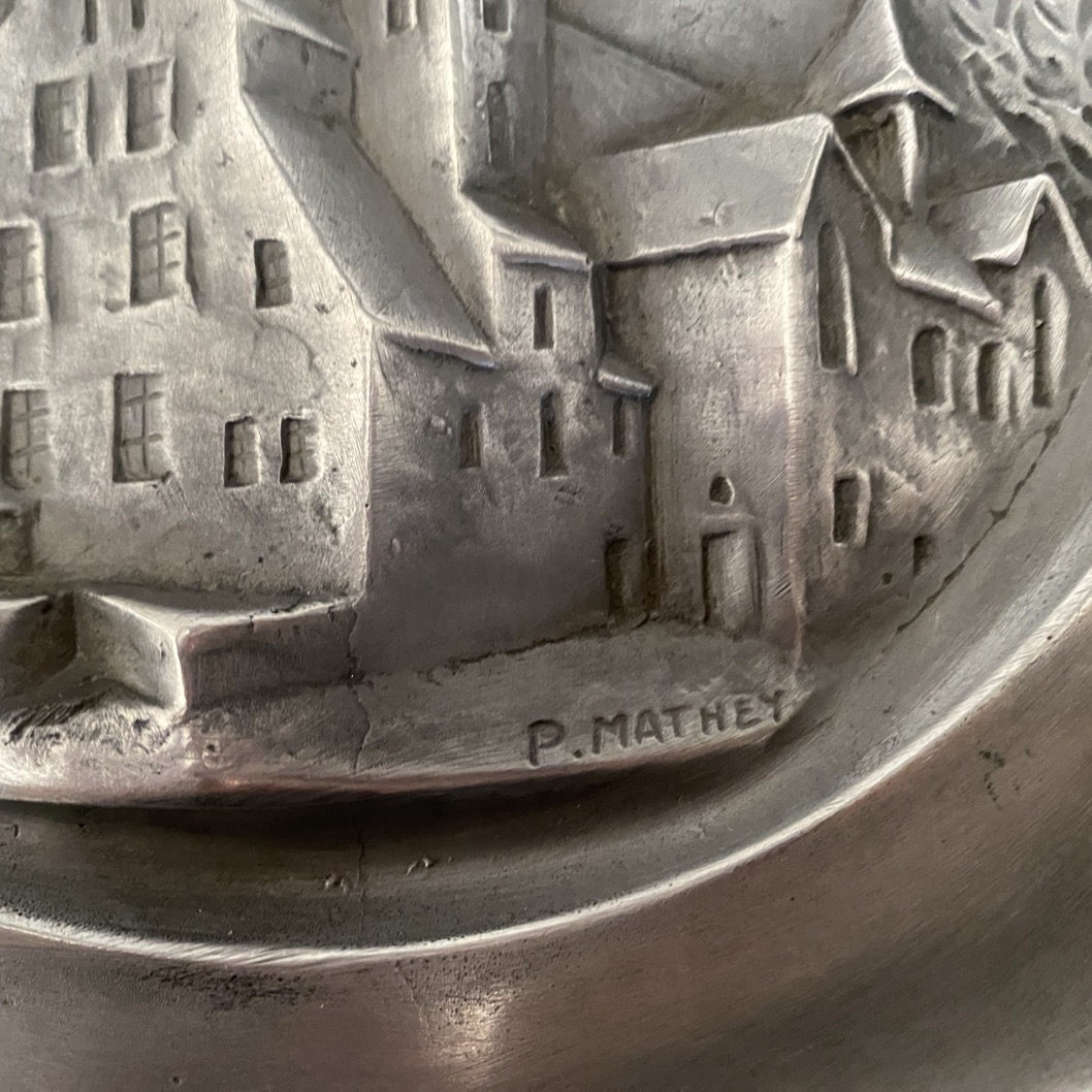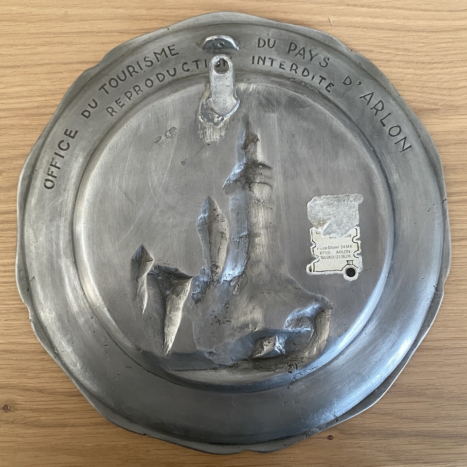 Assiette en étain (23 cm de diamètre), portant une représentation de Saint Donat, signée P.Mathey, un artiste de Frassem . Elle porte derrière  un poinçon avec une fleur, ainsi que les inscriptions « Office du tourisme du pays d’Arlon, reproduction interdite » et Don de la ville d’Arlon ».