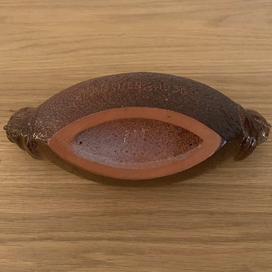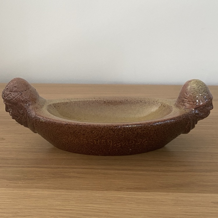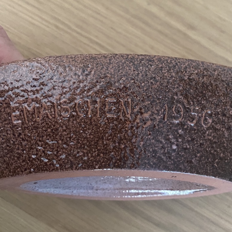 Petite cruche en faïence (20 cm de haut) éditée à l’occasion de l’Emaischen en 1973. Elle est signée dessous L.N. pour Léon Nosbusch (1897-1979) un sculpteur et peintre luxembourgeois, entre autres directeur d’une fabrique de porcelaine à Bruxelles. Il a obtenu le Prix Grand-Duc adolphe en 1929. Elle est en très bon état.