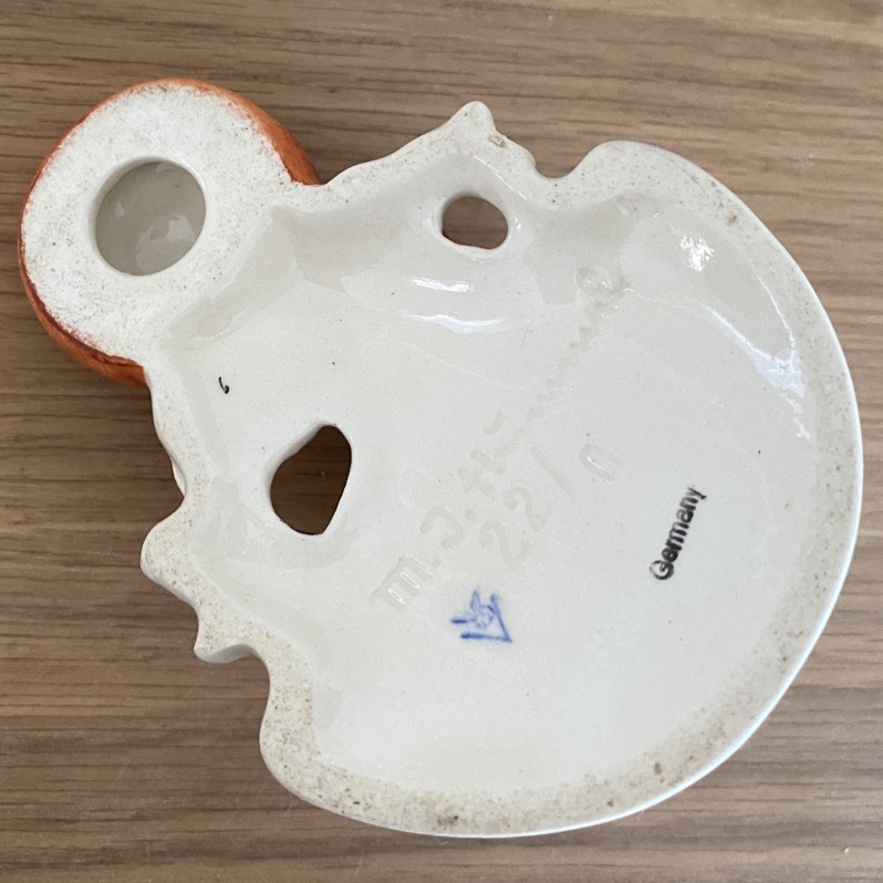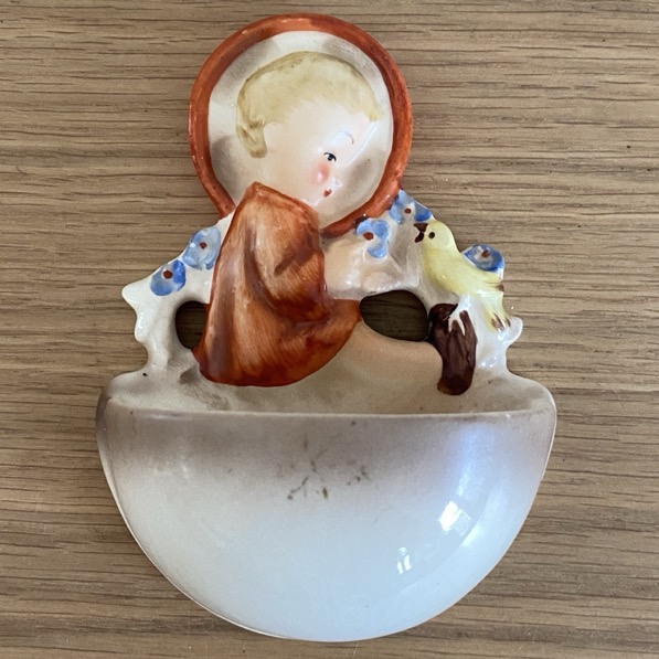 Bénitier avec un enfant et des oiseaux (9 cm de long), portant le numéro de forme 22/0 et produit par Goebel en Allemagne. Il est signé MI Hummel.