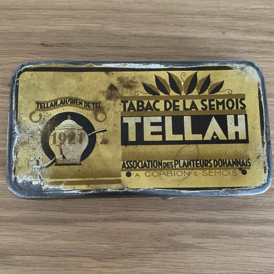 Petite boîte en métal (14×8 cm) de tabac de la Semois, Tellah à Corbion sur Semois. Pendant la guerre 1940-1945, Hallet de Corbion racheta les bâtiments de l’ancienne fabrique à cigarettes et commença à y fabriquer des cigarettes et du tabac, une activité florissante pendant la guerre, notamment grâce à la contrebande. Les cigarettes « Tellah » (Hallet lu à l’envers) étaient alors composées plus d’un mélange de tabacs étrangers que de « Semois ». La guerre terminée, la fraude disparut par la même occasion et ce fut la fin de la prospérité pour la fabrique de Vresse.