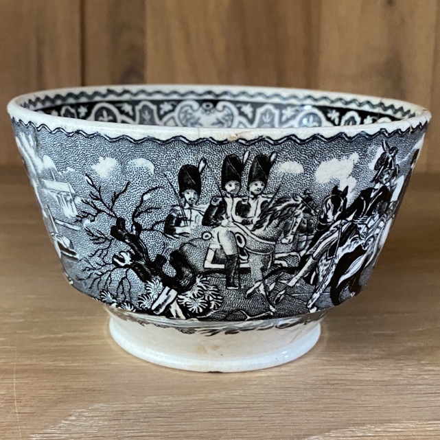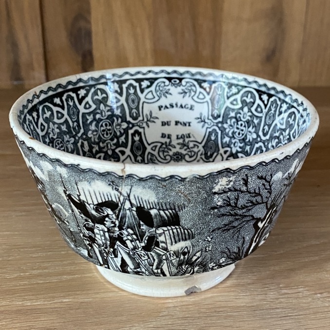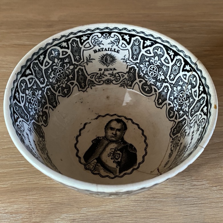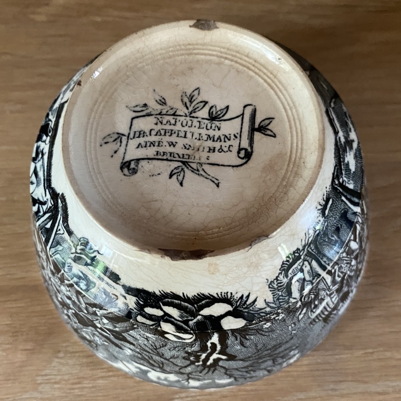 Bol en faïence fine (7 cm de haut) , portant des représentations de batailles de Napoléon. Il est marqué dessous d’un cachet noir « Napoléon/ J.B. Cappellemans/Aîné W.Smith & co/ Bruxelles ». L’intérieur est orné d’une image de Napoléon et le texte « Passage du Pont de Lodi ». Ce bol est issu de la manufacture de Jemappes (1837-1894). Cette manufacture créée en 1837 par Auguste Picard et Eugène Willems est rachetée en 1847 par l’industriel Jean-Baptiste Cappellemans en association avec l’Anglais William Smith. Les décors de Jemappes imprimés par transfert en noir, vert, bleu et violet sont très vite reconnus dans toutes les expositions.