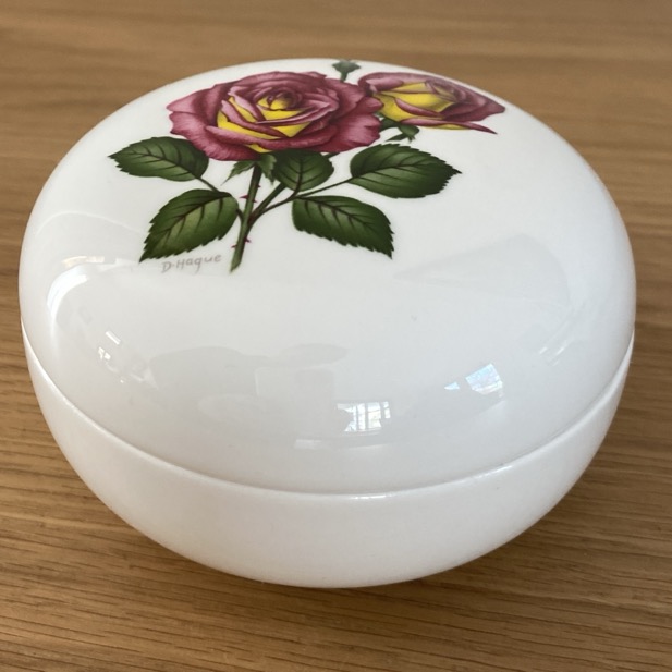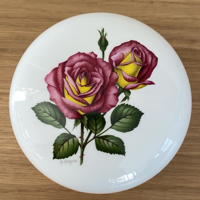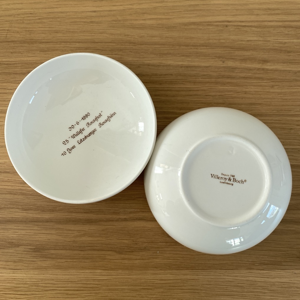 Bonbonnière en faïence (10 cm de diamètre) produite par Villeroy & Boch Luxembourg en 1990, pour l’anniversaire de la fête des roses de Walferdange. Elle est en parfait état.