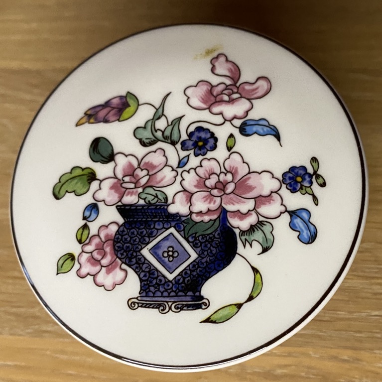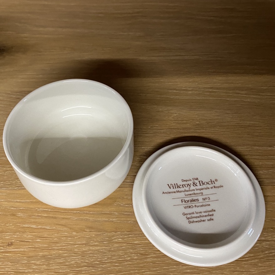Belle petite bonbonnière (7 cm de diamètre) produite par Villeroy & Boch Luxembourg, et portant la décoration « Floralies n°3 ». Elle est en parfait état.