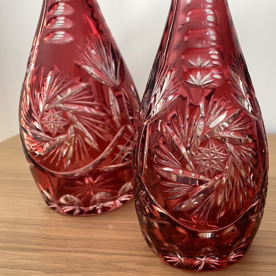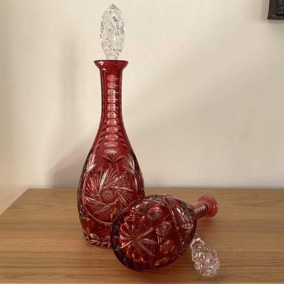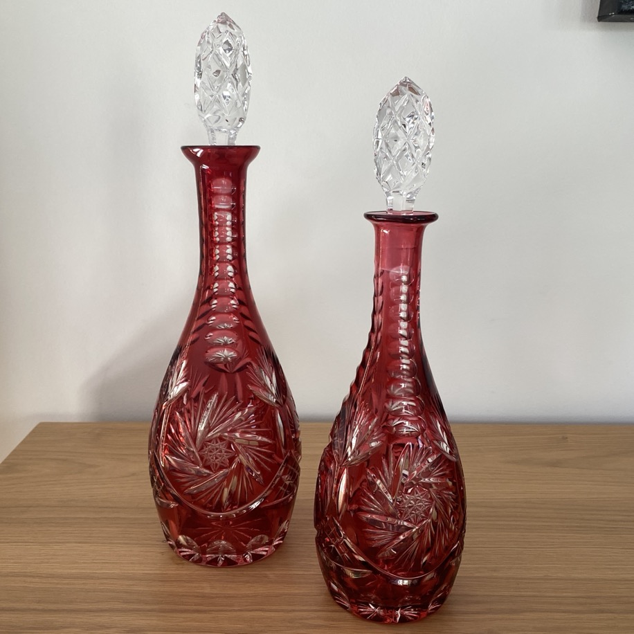 Deux belles carafes en cristal taillé rouge, de deux tailles différentes : 32 cm et 37 cm bouchon compris. Elles sont en parfait état. Il s’agit sans doute d’une production de Bohème.