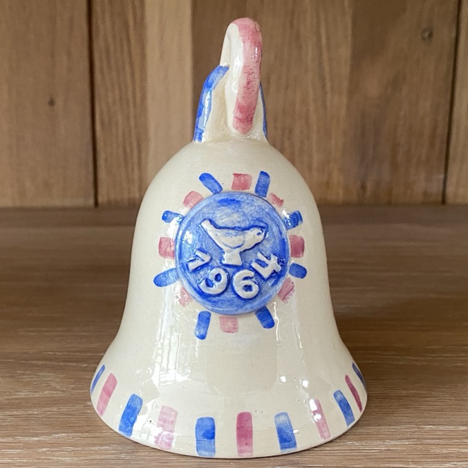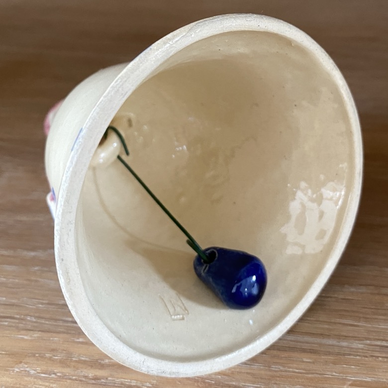 Cloche Emaïschen (11 cm de haut) éditée en 1964. Elle est signée à l’intérieur « L N ». Léon Nosbusch (1897-1979), un sculpteur et peintre luxembourgeois, entre autres directeur d’une fabrique de porcelaine à Bruxelles. Il a obtenu le Prix Grand-Duc adolphe en 1929. Elle est en très bon état.