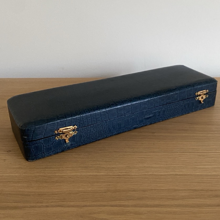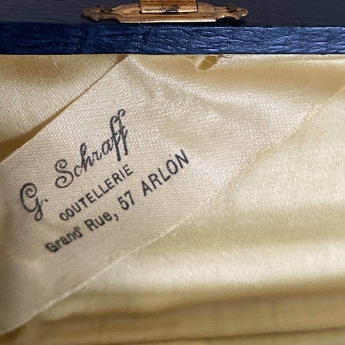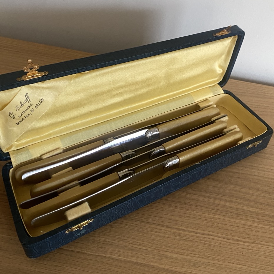Ensemble de 6 couteaux en métal et Bakélite, dans une boîte capitonnée. Cet ensemble vient de l’ancienne coutellerie Schraff à Arlon.