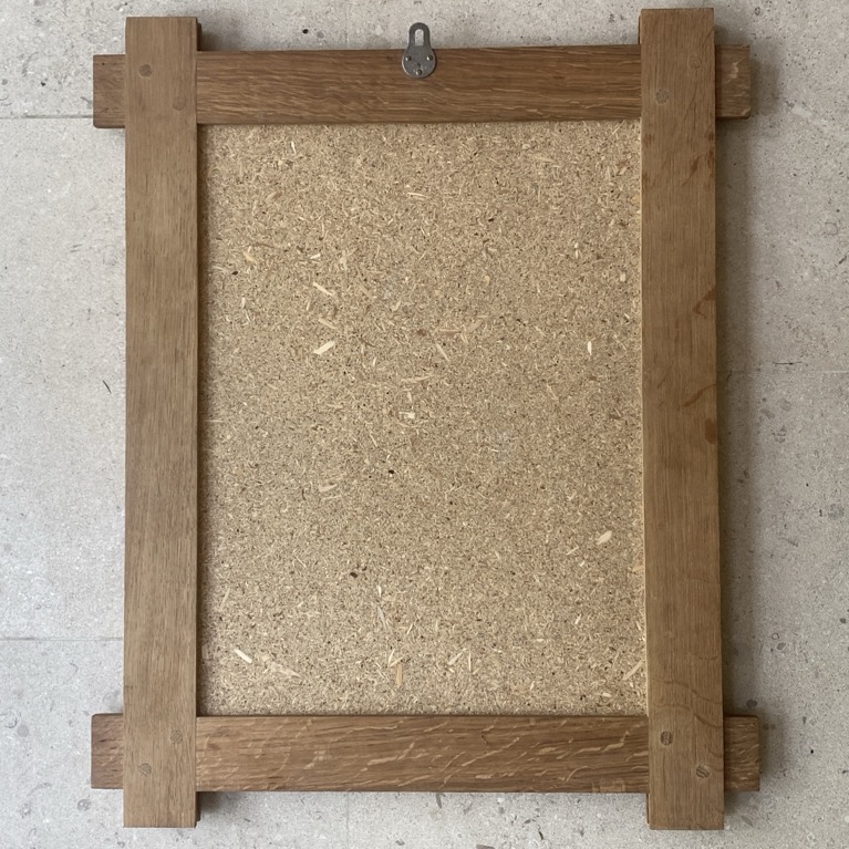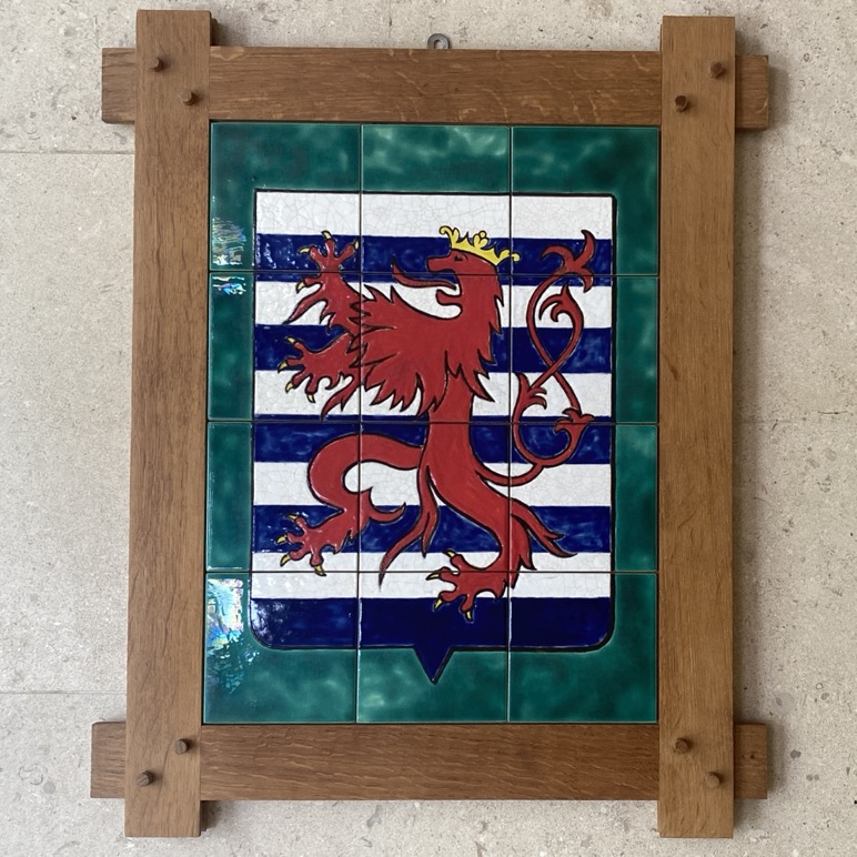 Grand assemblage sur panneau encadré de chêne (60×50 cm) de carrelages (11 cm de côté) représentant l’écusson de la Province de Luxembourg. Ces carrelages ont probablement été créé par Ernest Bernardy (Athus 1923-2000), un artiste athusien, attaché à la Gaume.
