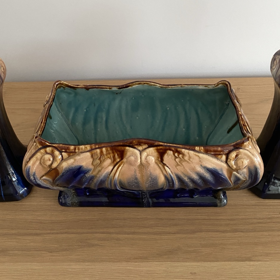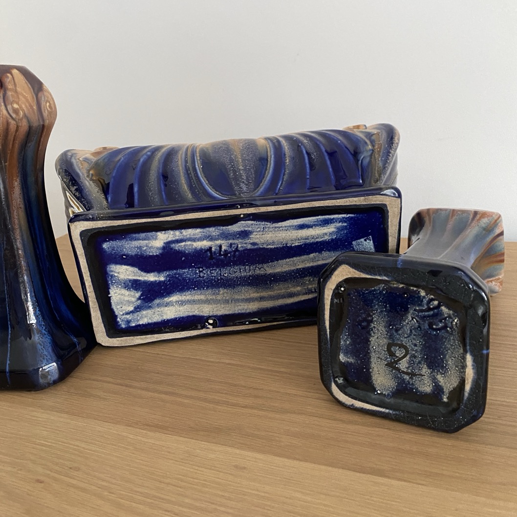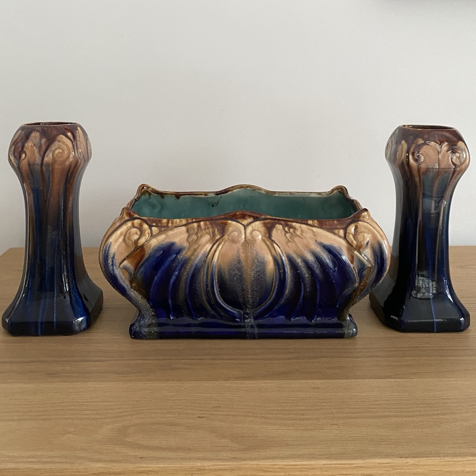 Belle jardinière (28 cm de long) accompagnée de ses deux vases assortis (21 cm de haut) en parfait état, parés d’un bel émail coulant en barbotine. La jardinière est marquée dessous « 147 Belgium » et les vases « 95 Belgium ». Ce sont des productions de la faiencerie de Thulin (1887-1973). L’ensemble date des années 1930, période Art Déco.