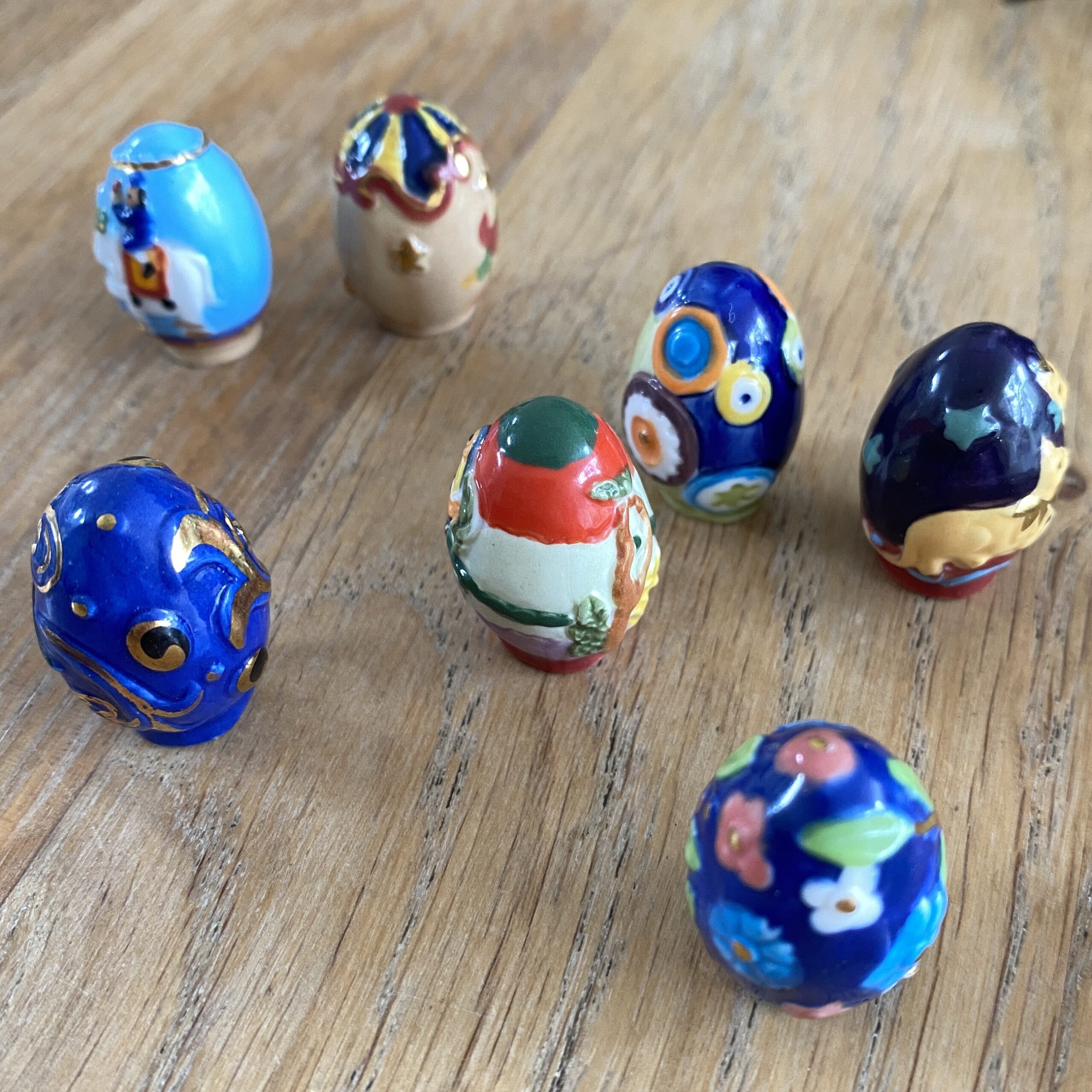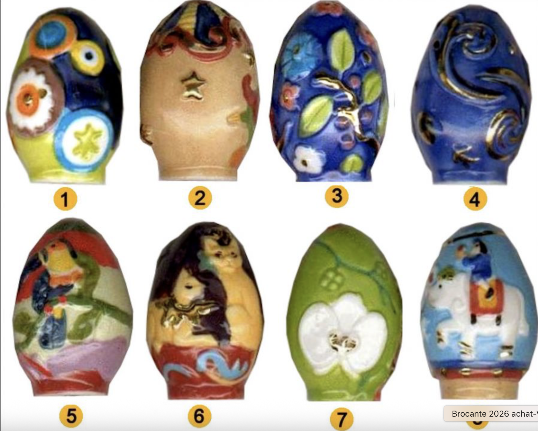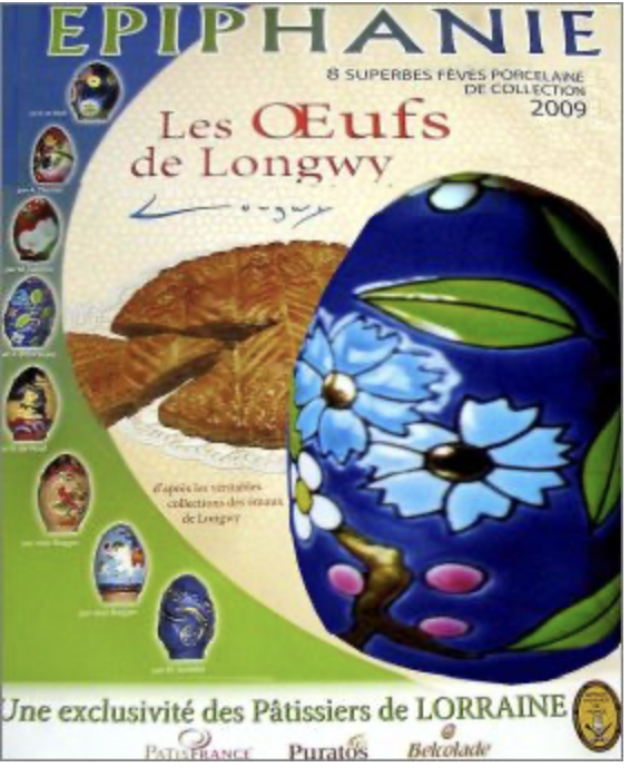 7 fèves de galettes de roi, en Emaux de Longwy. Ces fèves ont été créées en 2009; la collection compléte compred 8 fèves, mais seules 7 sont disponibles. Elles sont vendues à la pièce au prix de 3€ pièce.