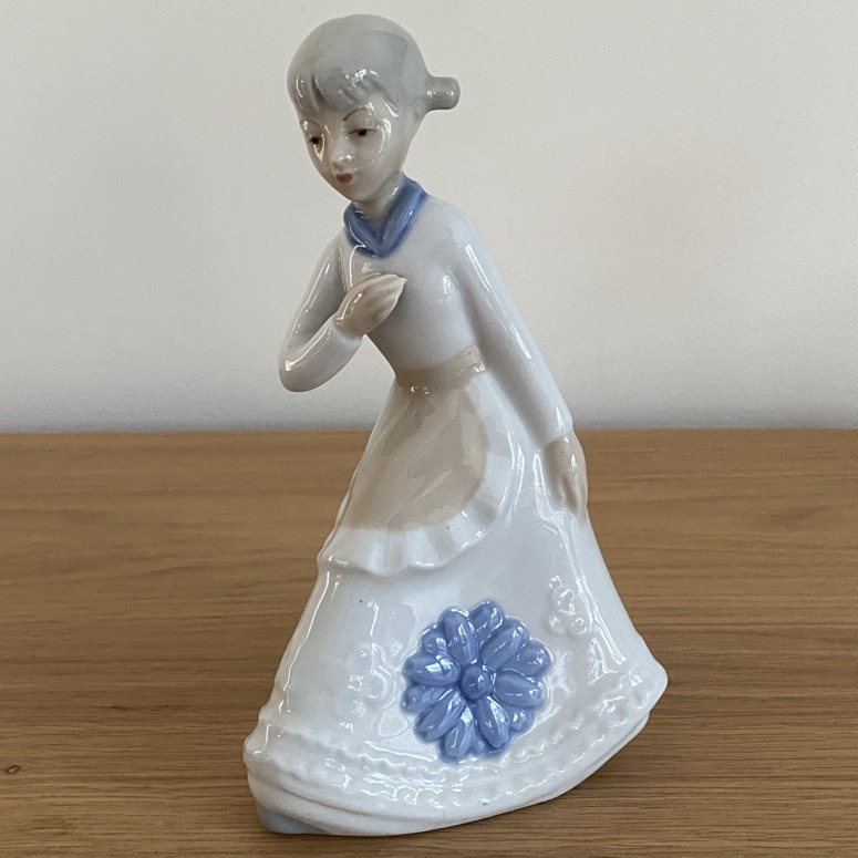 Figurine de fillette en porcelaine (18 cm de haut), signée dessous Mv. Cette figurine est dans le gout des porcelaines de Lladro en Espagne.