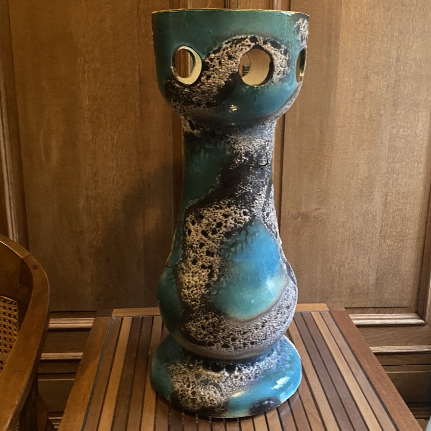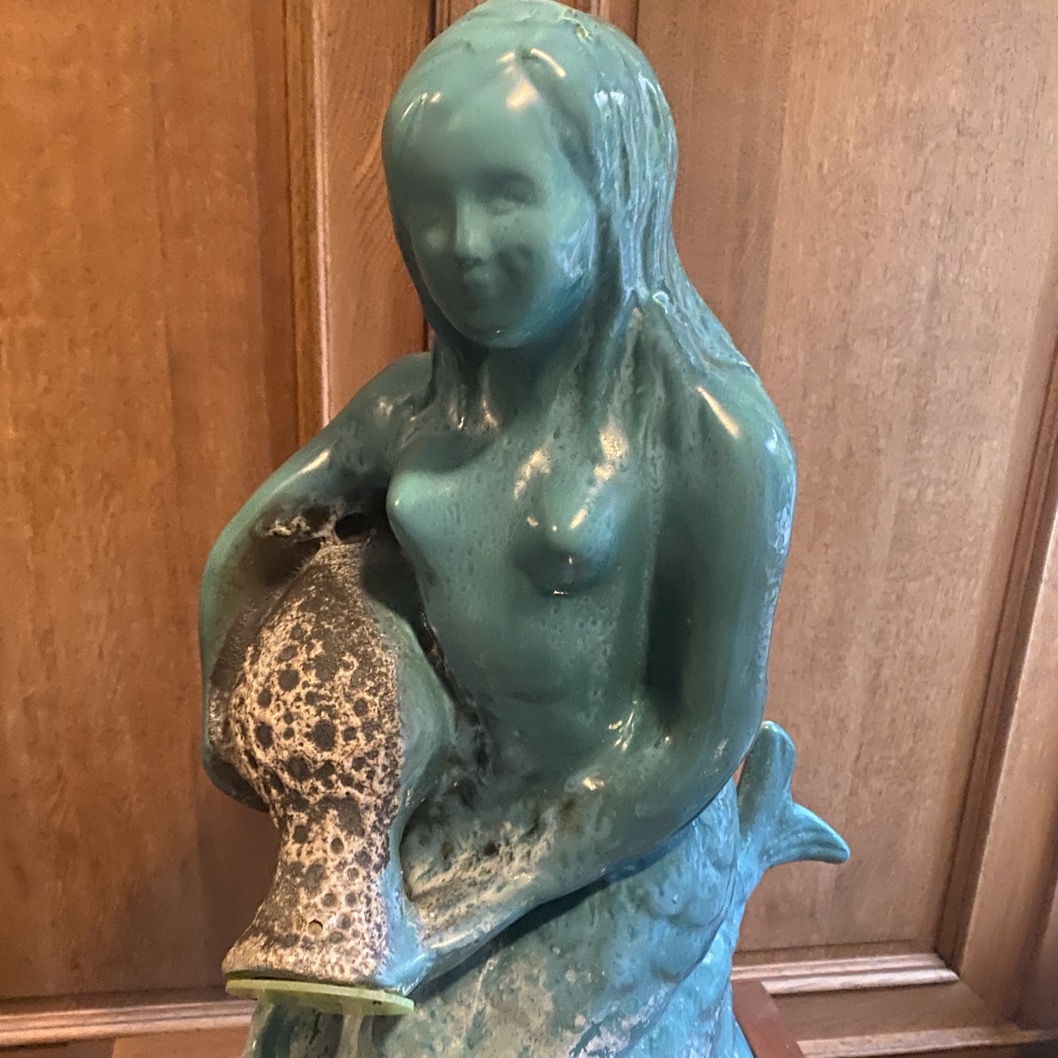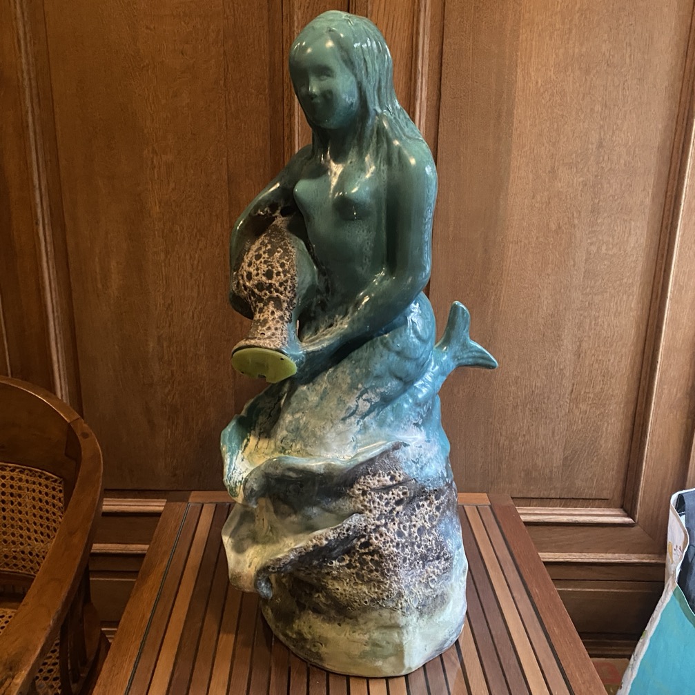 Belle grande fontaine (cm de haut) en céramique émaillée polychrome, provenant de Vallauris, haut lieu de la céramique artistique française du 20è siècle. Elle représente une sirène assise tenant une amphore d’où jaillit l’eau, surmontant un large bassin en forme de coquillage sur un piédestal. Elle date des années 1970 et est en parfait état (si ce n’est un dépôt de calcaire dans la cuvette).
