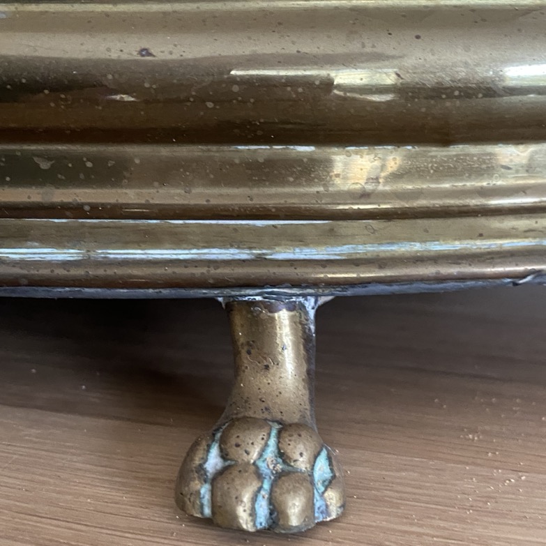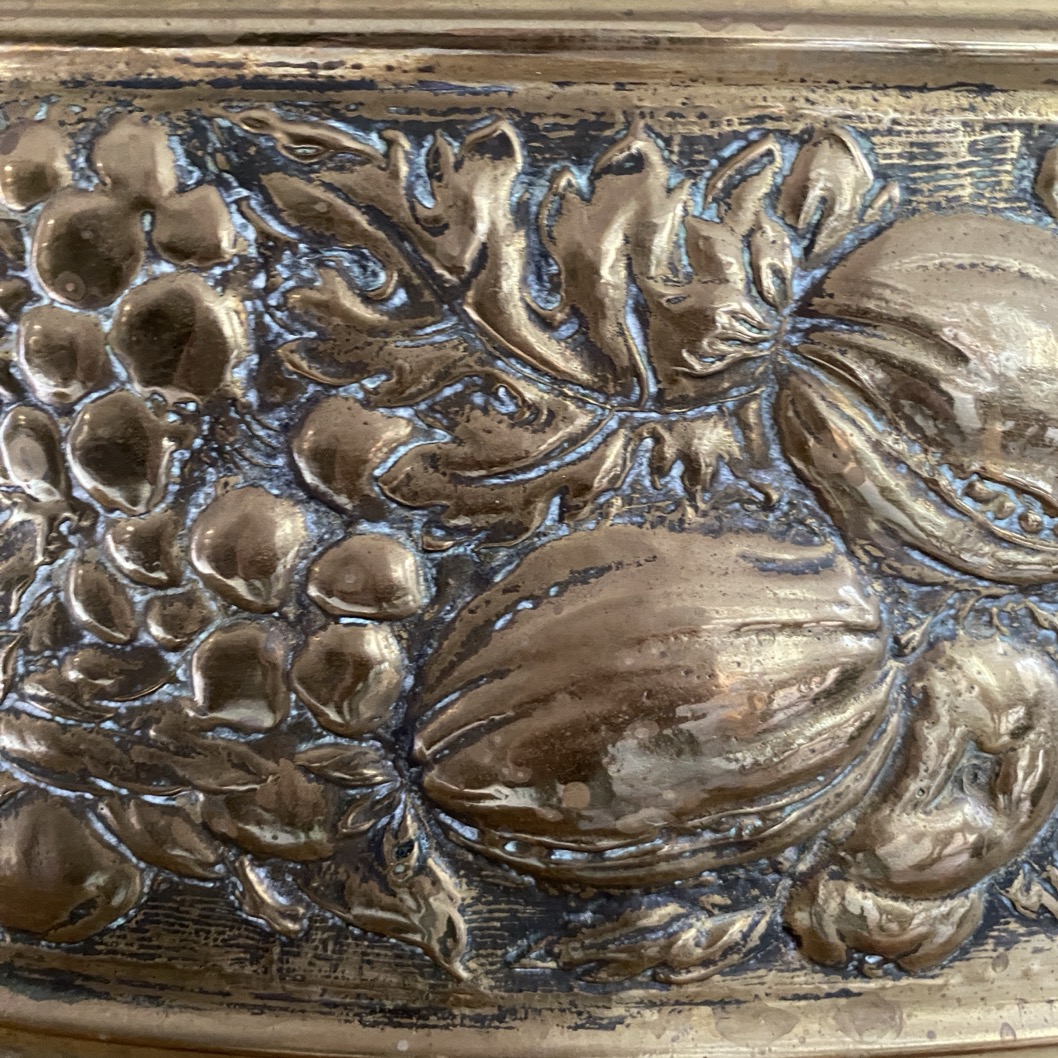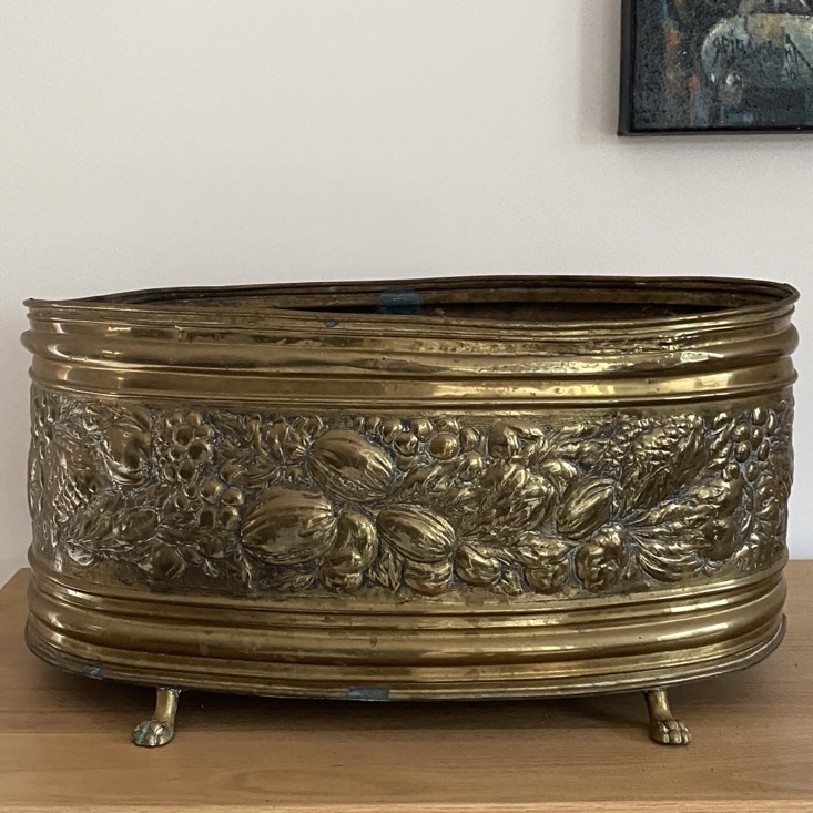 Belle grande jardinière ovale (54 cm de long) en laiton repoussé avec un décor de fruits et fleurs, datant sans doute de la fin du 19è-début du 20è siècle. Elle repose sur 4 petits pieds en forme de pattes de mon.