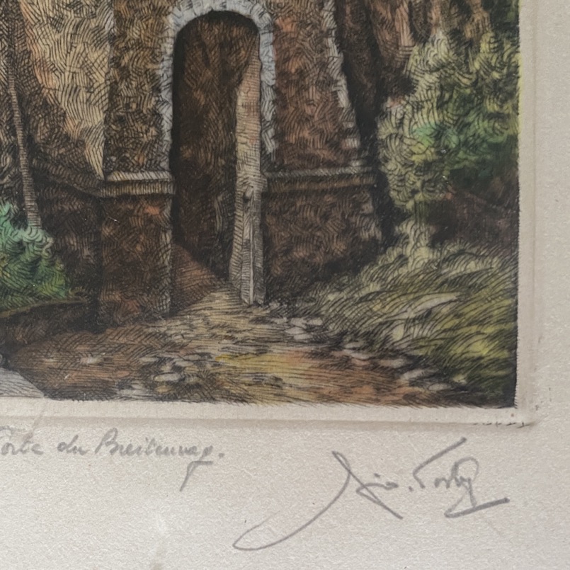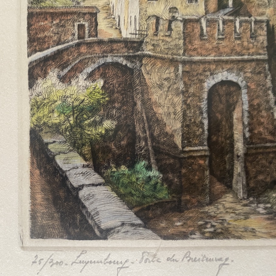 Gravure couleur(31×41 cm cadre compris) de la « Porte du Breiteweg – Luxembourg », signée de la main de l’artiste en bas à droite et Justifiée 75/300. Géo Fosty (Arlon 1913- 2002) a fait ses études à l’Académie des Beaux-arts de Bruxelles, d’où il sortit en 1934. Il se lance alors dans le dessin humoristique et la caricature et ira même jusqu’à représenter Staline et Hitler en frères Siamois. C’est en 1939 qu’il entre comme professeur de dessin à l’Athénée Royal d’Arlon, où il enseignera jusqu’en 1972. En mai 1940, il a participé à la campagne des 18 jours, puis a été retenu prisonnier de guerre, où il fut autorisé à dessiner, d’abord quelques croquis sur des carnets, puis des dessins plus travaillés. À côté de cela, il produit de nombreux dessins et aquarelles, excelle dans l’art de l’eau-forte et de la pointe sèche. Son sujet de prédilection : les paysages du Luxembourg, les beaux paysages d’Arlon et des alentours.