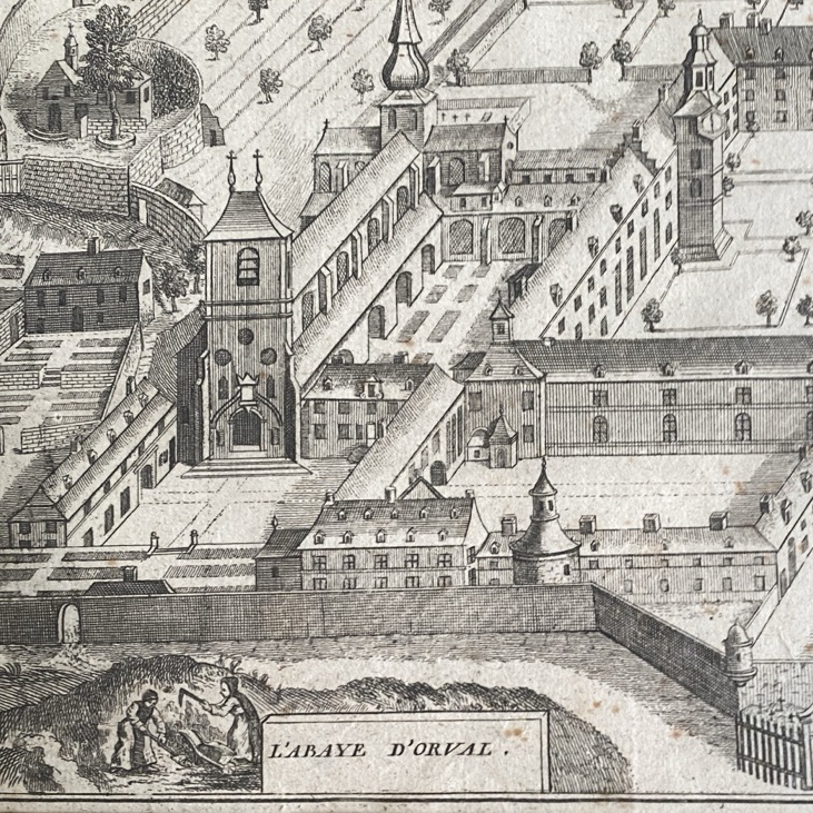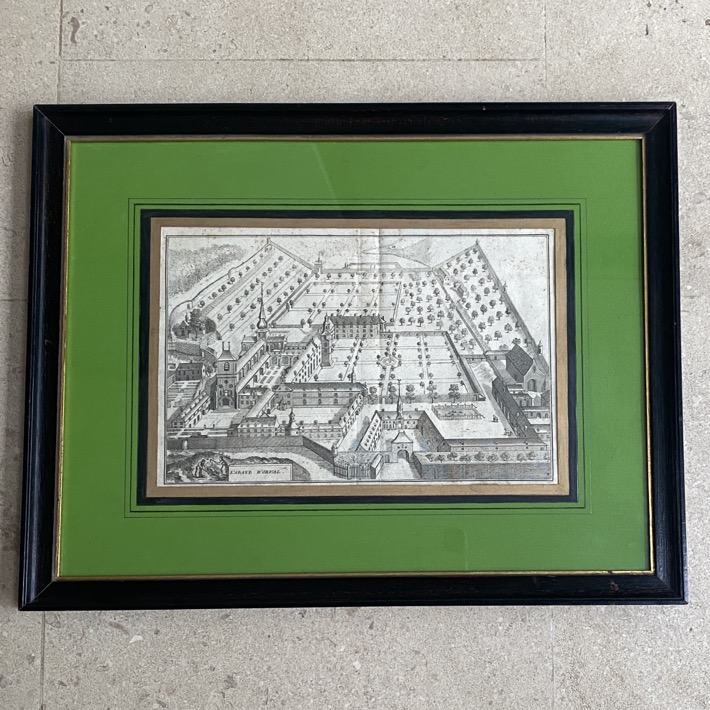 Belle gravure encadrée (52×41 cadre compris) représentant l’Abbaye d’Orval. Cette gravure est signée dans la panache Harrewijn sculp, Jacobus Harrewijn est un graveur bruxellois du 18è siècle qui se spécialisa notamment dans la gravure de cartes, plans et vues remarquables de Bruxelles et des Pays-Bas espagnols. Cette gravure est extraite de « les Délices des Pays-Bas » attribué à Jean-Baptiste Christyn. Cette gravure date probablement du 18è siècle (édition 1887).