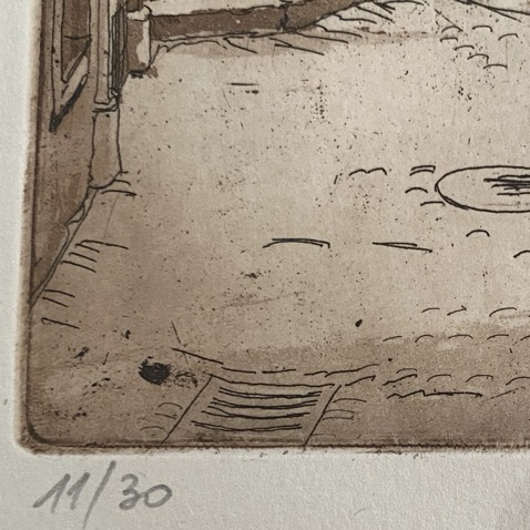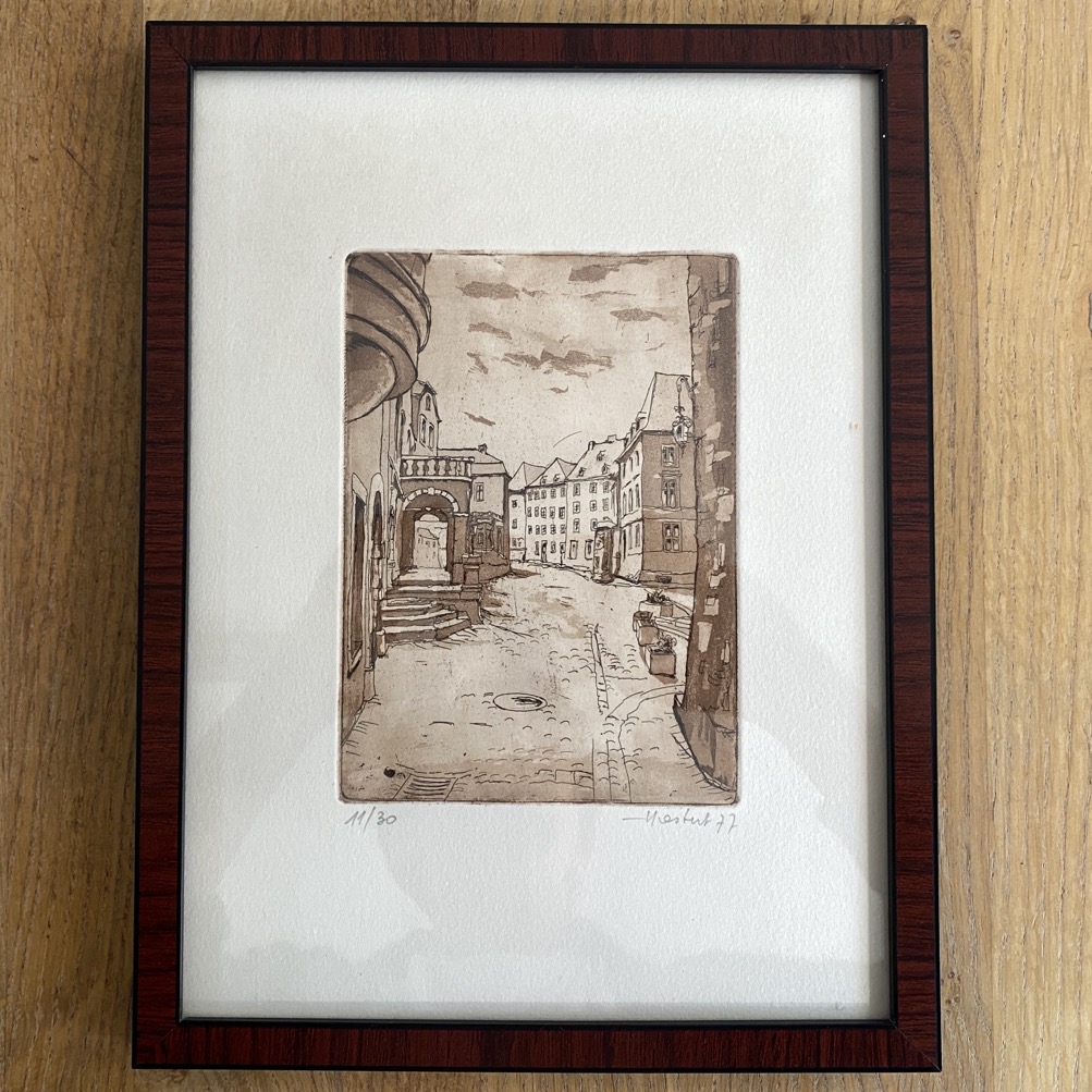 Belle gravure (33×25 cm cadre compris) représentant une vue de Luxembourg. Elle a été réalisée par Norbert Hastert en 1977. Elle est numérotée 11/30. Norbert Hastert, né Luxembourg en 1942, a appris l’art à Trèves et est membre du Cercle Artistique de Luxembourg.