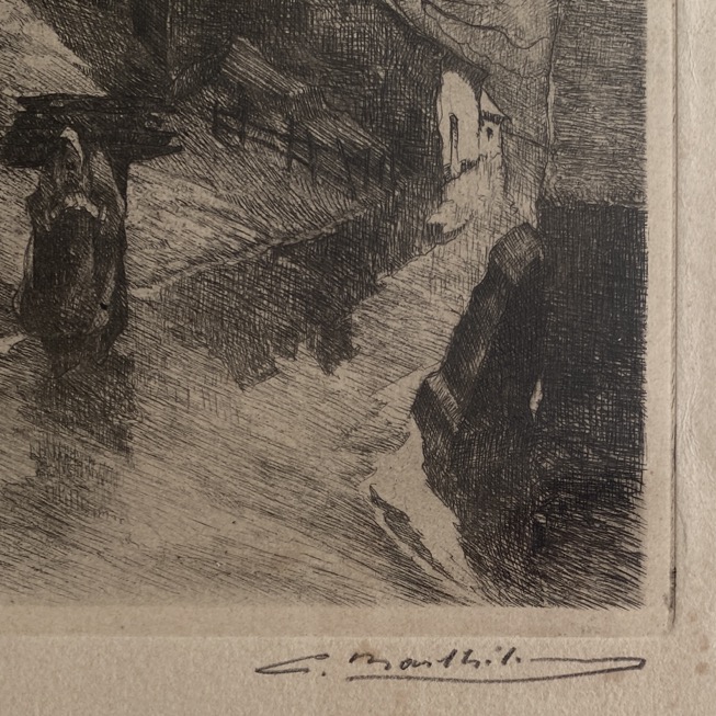 Belle gravure (53×43 cadre comprisx30cm; dimensions du cuivre 26×21,1 cm) de Camille Barthélémy, signée en bas à droite mais non numérotée. Cette « Porteuse de fagot à Our » est inventoriée dans le livre de André Martin « Camille Barthélémy, Les gravures, p 191. L’original a été tiré à 30 exemplaires, et le cuivre est daté de 1951. Camille Barthélémy (1890 Virton – 1961 Virton), graveur (pointe-sèche), peintre (huile, aquarelle) et dessinateur, il vécut et travailla à Chiny et à Chameleux, un petit hameau de Florenville situé à la frontière française, pour être aussi proche de la nature qu’il cherchait à restituer. Son professeur de dessin au collège communal, Nestor Outer, lui remarqua très tôt des dons pour le dessin et l’encouragea à poursuivre des études artistiques. De 1906 à 1914, il fréquenta l’Académie des Beaux-Arts à Bruxelles et fit ses débuts chez des peintres décorateurs. Il pratique la peinture à partir de 1916, mais se consacra aussi à l’enseignement du dessin à l’École moyenne de Schaerbeek et de Diest. Attiré d’abord par les paysages flamands et l’impressionnisme, il revint peu à peu à peindre les Ardennes en couleurs fortes et formes géométrisées. L’exposition L’Ardenne sous la neige (Bruxelles, 1931) le consacre comme l’un des meilleurs peintres de la région. Il s’en éloigne pourtant et s’installe, à Chiny, dans une maison qu’il avait acquise en 1922 avec Irène Fech, institutrice à Arlon qu’il avait épousée en 1920, et s’attacher à la peinture des paysages gaumais.