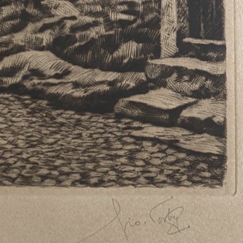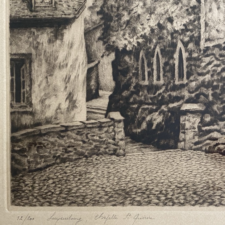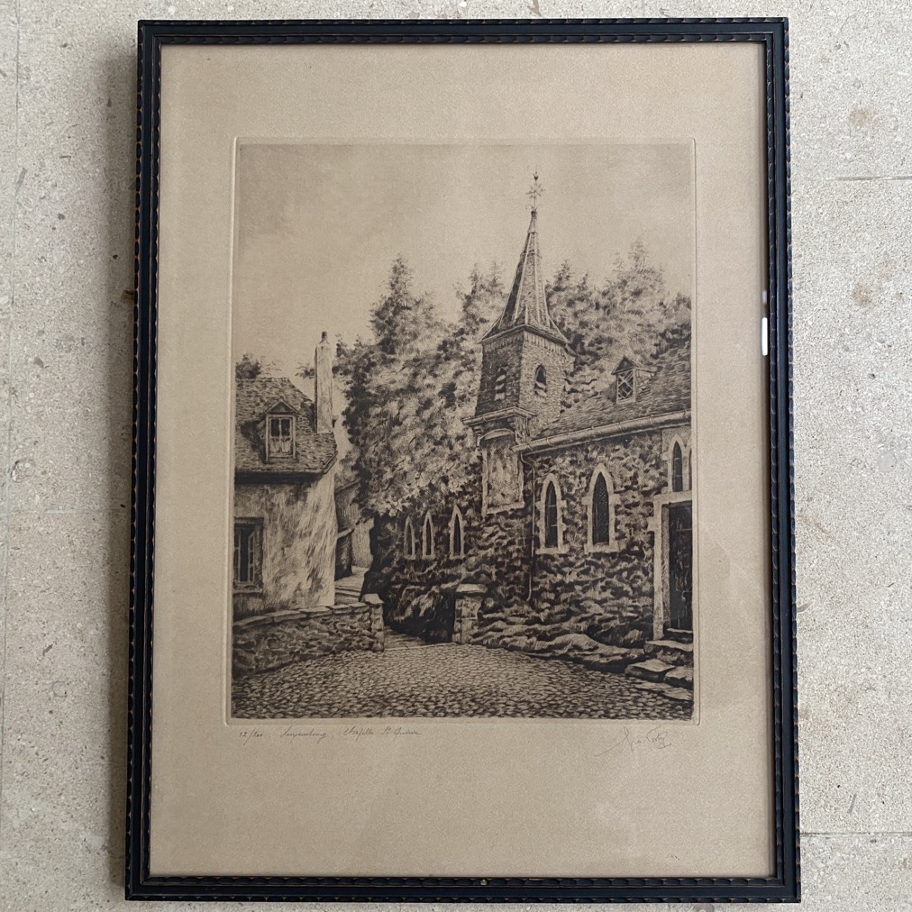 Gravure (53×40 cm cadre compris) de la Chapelle St Quirin à Luxembourg, signée de la main de l’artiste en bas à droite ainsi que numérotée 12/200. Géo Fosty (Arlon 1913- 2002) a fait ses études à l’Académie des Beaux-arts de Bruxelles, d’où il sortit en 1934. Il se lance alors dans le dessin humoristique et la caricature et ira même jusqu’à représenter Staline et Hitler en frères Siamois. C’est en 1939 qu’il entre comme professeur de dessin à l’Athénée Royal d’Arlon, où il enseignera jusqu’en 1972. En mai 1940, il a participé à la campagne des 18 jours, puis a été retenu prisonnier de guerre, où il fut autorisé à dessiner, d’abord quelques croquis sur des carnets, puis des dessins plus travaillés. À côté de cela, il produit de nombreux dessins et aquarelles, excelle dans l’art de l’eau-forte et de la pointe sèche. Son sujet de prédilection : les paysages du Luxembourg, les beaux paysages d’Arlon et des alentours.