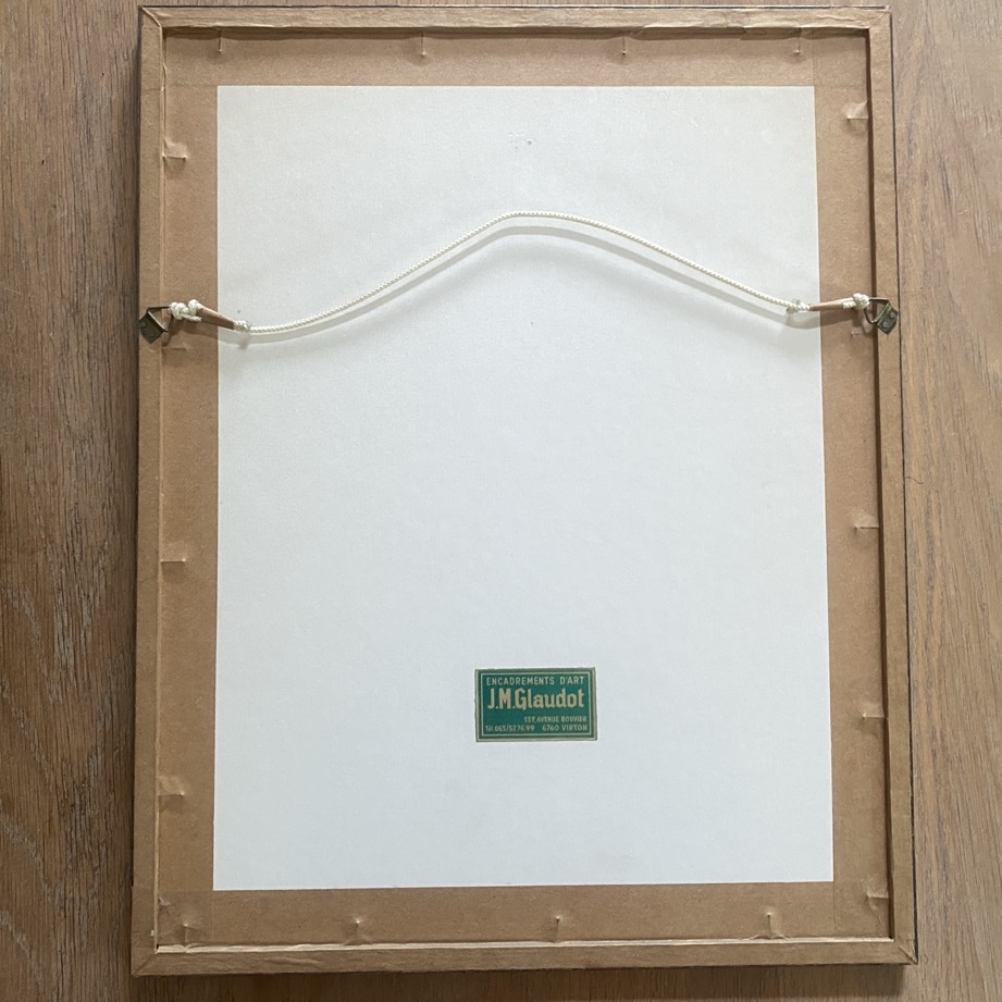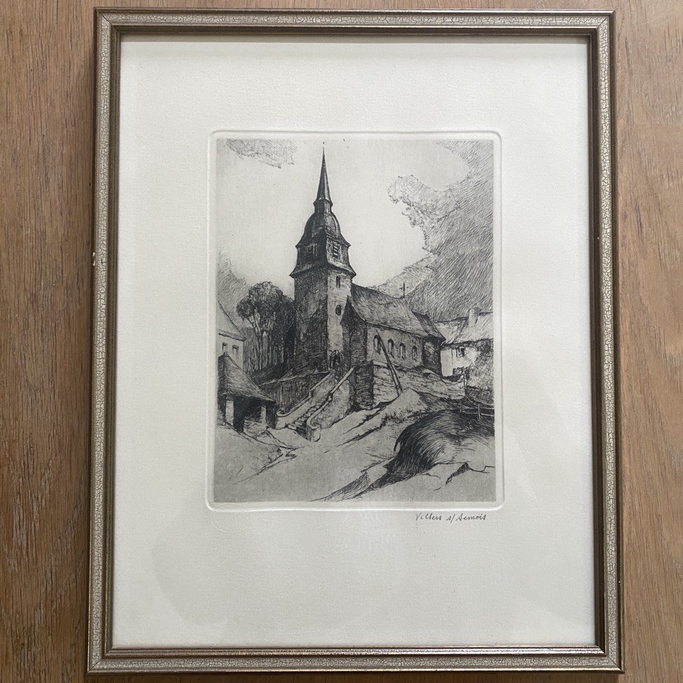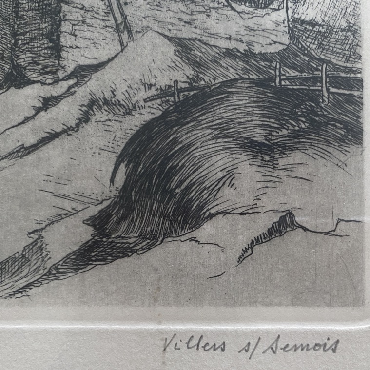 Belle gravure (40x32cm cadre compris; dimensions du cuivre 22,9×17,9 cm) de Camille Barthélémy, non signée et non numérotée. Il s’agit sans doute d’une réédition dûe à Irène Barthélémy, l’épouse de l’artiste. Elle est inventoriée dans le livre de André Martin « Camille Barthélémy, Les gravures, p 181. Camille Barthélémy (1890 Virton – 1961 Virton), graveur (pointe-sèche), peintre (huile, aquarelle) et dessinateur, il vécut et travailla à Chiny et à Chameleux, un petit hameau de Florenville situé à la frontière française, pour être aussi proche de la nature qu’il cherchait à restituer. Son professeur de dessin au collège communal, Nestor Outer, lui remarqua très tôt des dons pour le dessin et l’encouragea à poursuivre des études artistiques. De 1906 à 1914, il fréquenta l’Académie des Beaux-Arts à Bruxelles et fit ses débuts chez des peintres décorateurs. Il pratique la peinture à partir de 1916, mais se consacra aussi à l’enseignement du dessin à l’École moyenne de Schaerbeek et de Diest. Attiré d’abord par les paysages flamands et l’impressionnisme, il revint peu à peu à peindre les Ardennes en couleurs fortes et formes géométrisées. L’exposition L’Ardenne sous la neige (Bruxelles, 1931) le consacre comme l’un des meilleurs peintres de la région. Il s’en éloigne pourtant et s’installe, à Chiny, dans une maison qu’il avait acquise en 1922 avec Irène Fech, institutrice à Arlon qu’il avait épousée en 1920, et s’attacher à la peinture des paysages gaumais.