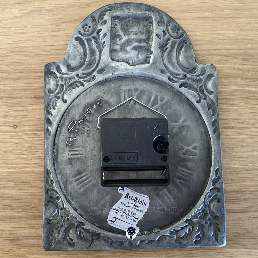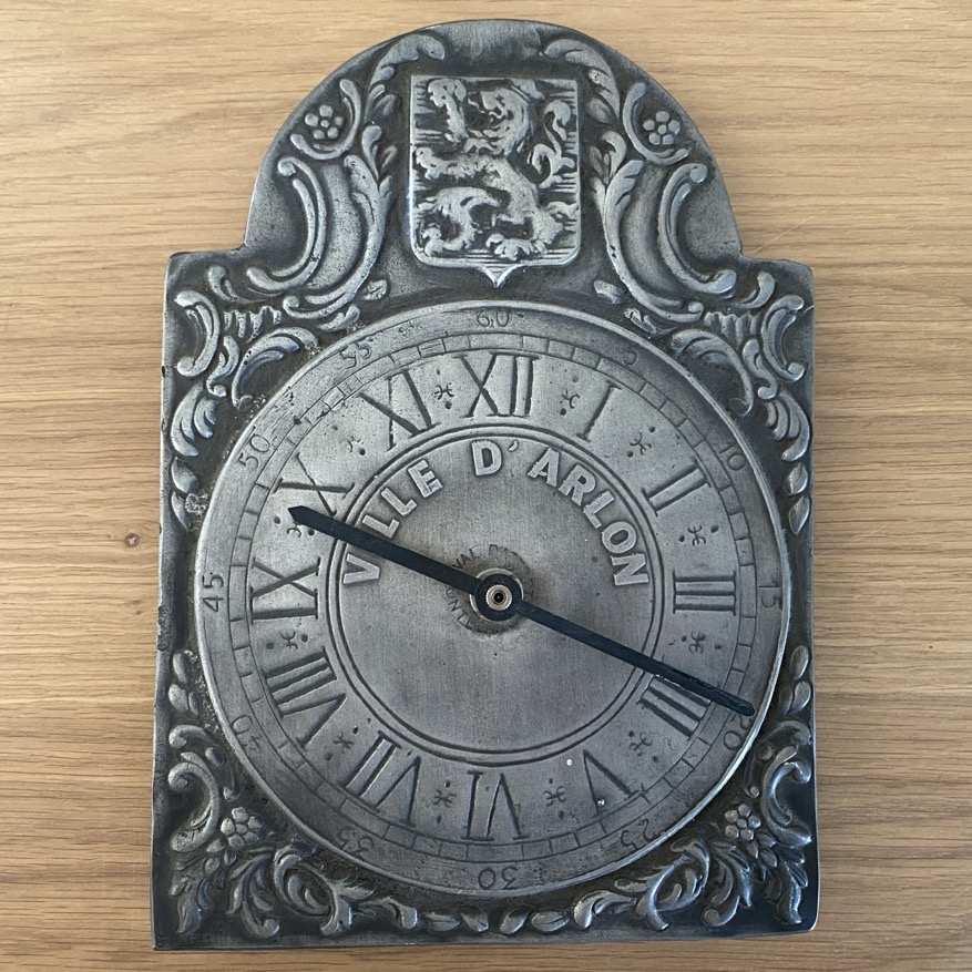 Horloge en étain (22 cm de long), portant l’inscription « Ville d’Arlon ». Elle est signée à l’arrière R.Pougin ainsi que Tontelange Art Etain, Val d’Attert. Elle porte également l’étiquette du producteur.