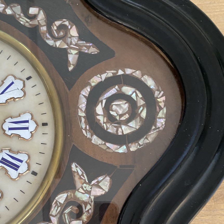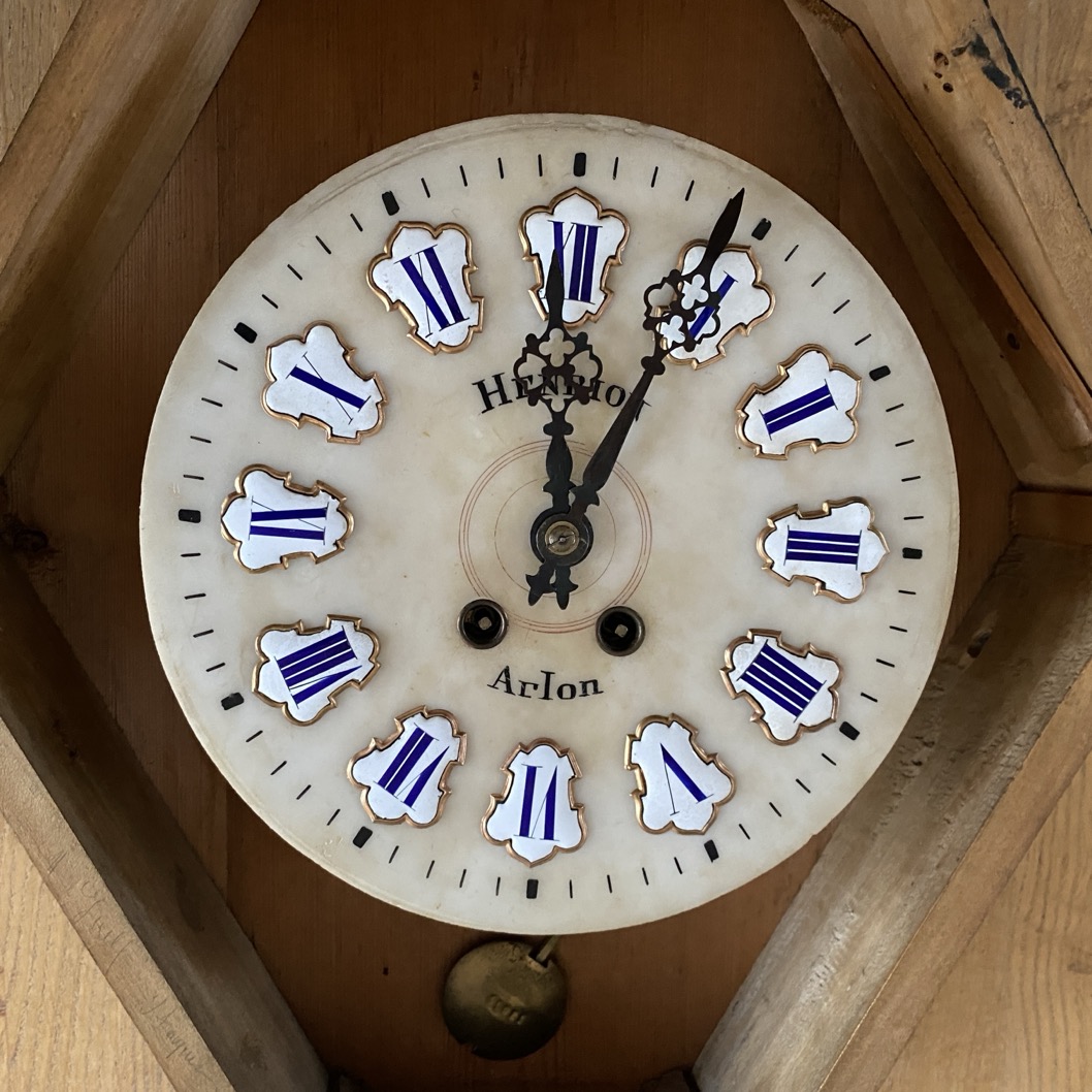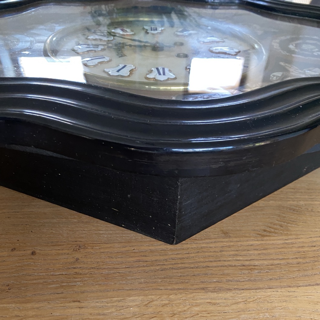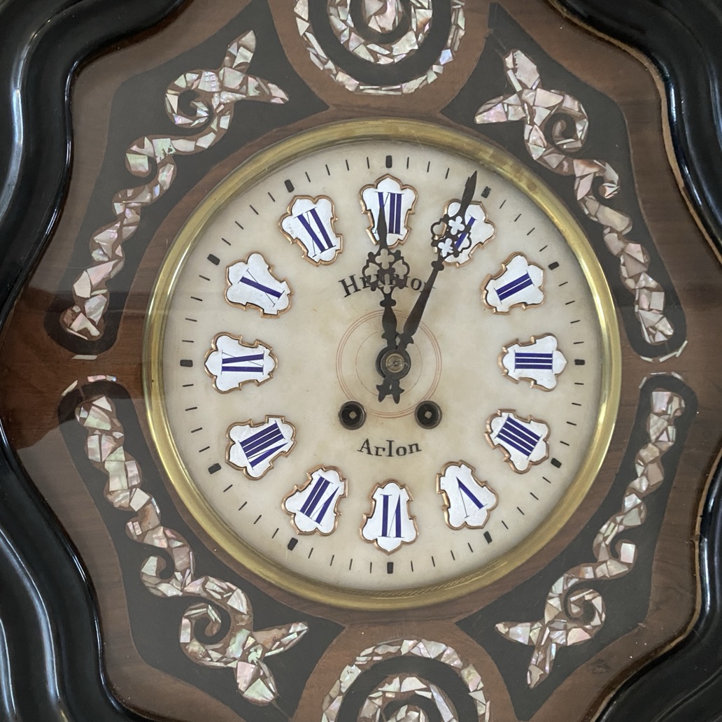 Belle horloge murale « oeil-de-boeuf » (51×62 cm) probablement de l’Epoque Napoléon III (1850-1870) avec un cadre noirci de forme chantournée et des incrustations de nacre dans des motifs décoratifs. le cadran émaillé porte des chiffres romains émaillés. Le cadran porte les inscriptions « Henrion » et « Arlon ». La maison Herion existe depuis 1850 à Arlon (peut-être avant à Virton).