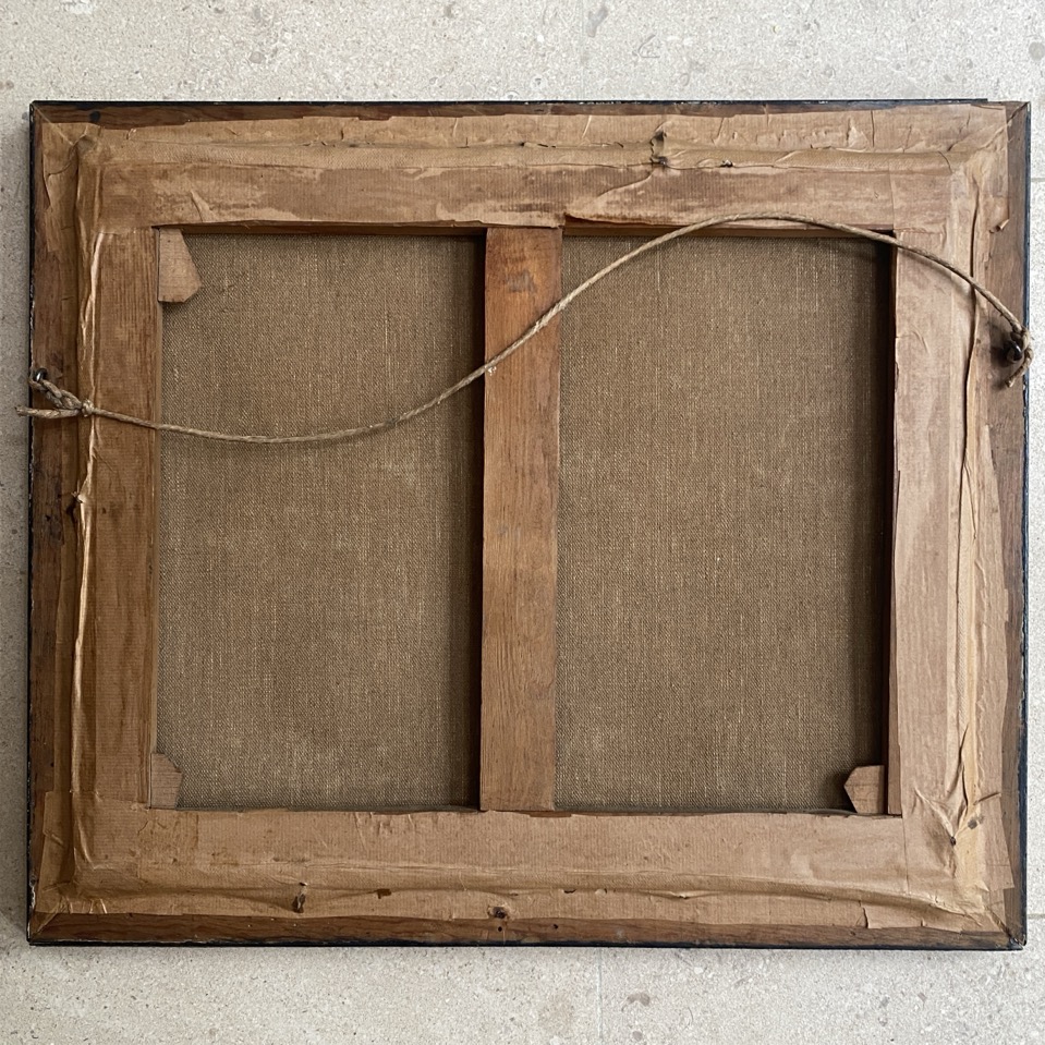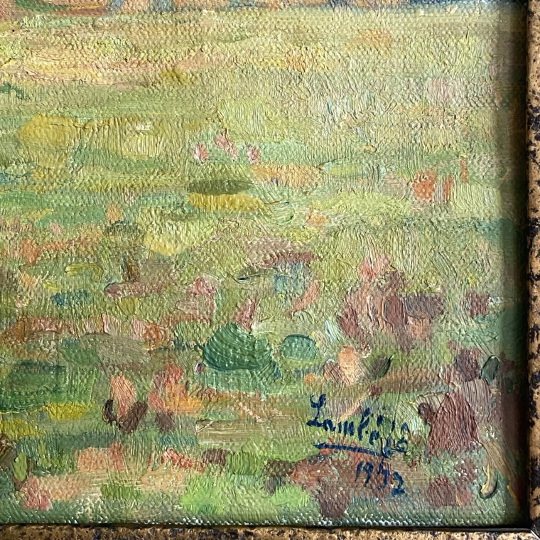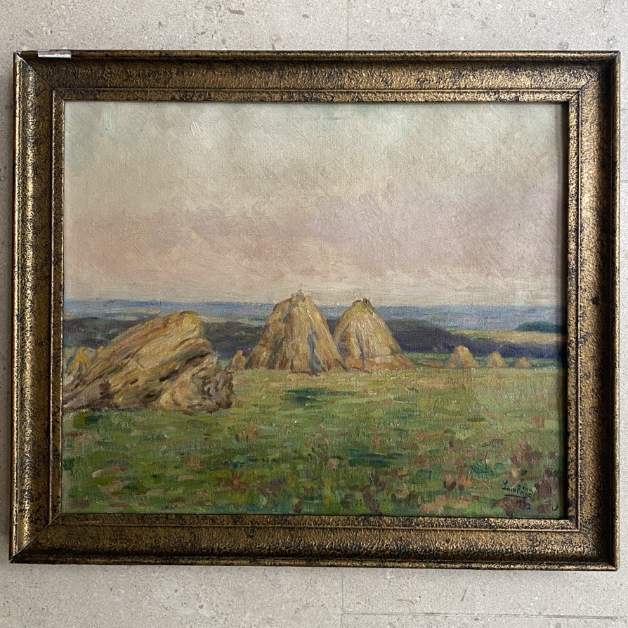 Huile sur toile (54×46 cm cadre compris) d’un paysage avec meules de foin. Cette toile est signée en bas à droite « Lambé » et datée 1932. Jean-Baptiste Lambé (1867 Arlon -1952 Arlon) était un peintre portraitiste et paysagiste, dessinateur et aquarelliste. Après des études atistiques à Buxelles, et Anvers, le Prix de Rome, il fut professeur de dessin à l’Athénée Royal d’Arlon, ) l’Académie des Beaux arts et à l’Ecole Industrielle d’Arlon. Son atelier était situé Chemin de Clairefontaine. Il fut entre autres le maître de Lucien Bidaine et Emile Meyers.