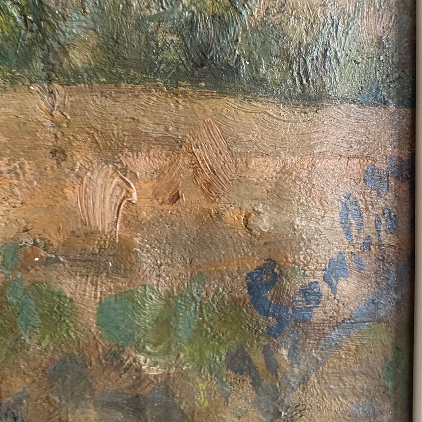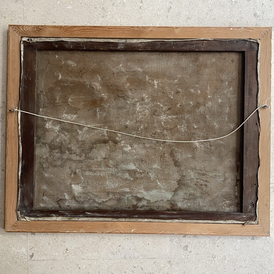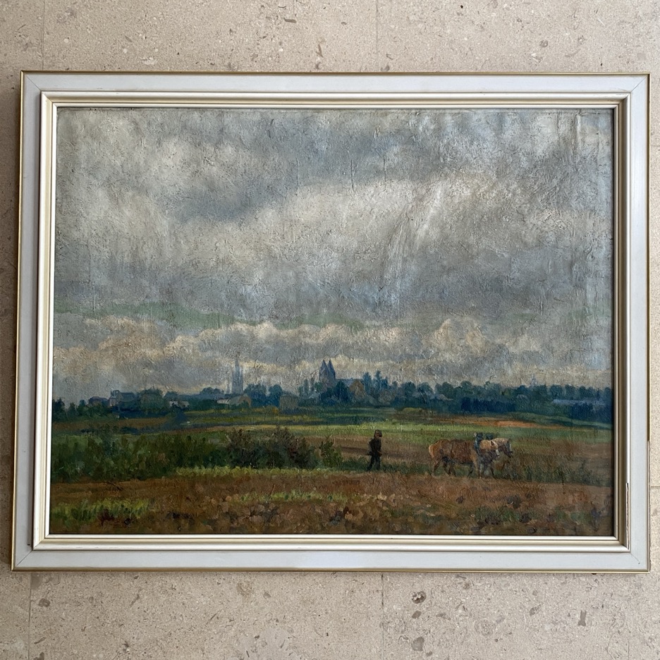 Huile sur toile (57×72 cm cadre compris) d’un panorama d’Arlon avec laboureur en avant-plan. Cette toile est signée en bas à droite « Lambé » et datée 1928? Jean-Baptiste Lambé (1867 Arlon -1952 Arlon) était un peintre portraitiste et paysagiste, dessinateur et aquarelliste. Après des études artistiques à Buxelles, et Anvers, le Prix de Rome, il fut professeur de dessin à l’Athénée Royal d’Arlon, ) l’Académie des Beaux arts et à l’Ecole Industrielle d’Arlon. Son atelier était situé Chemin de Clairefontaine. Il fut entre autres le maître de Lucien Bidaine et Emile Meyers.