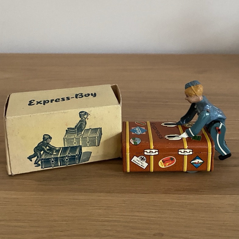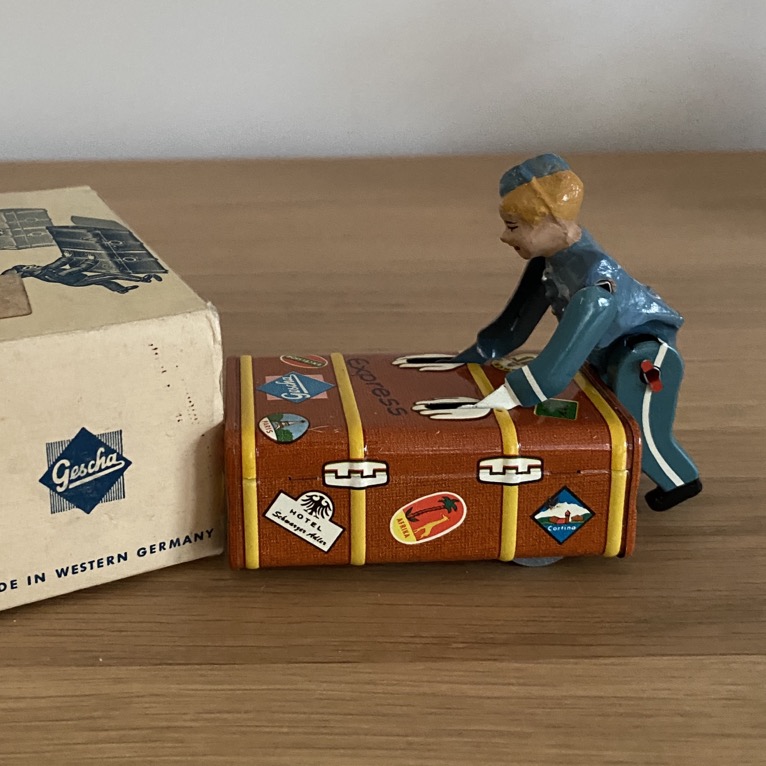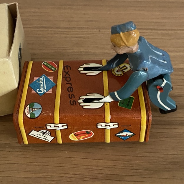 Jouet mécanique en tôle de la marque Gescha, datant des années 1950-60 et produit en Allemagne. Il s’agit d’un porteur de valise mécanique, dans sa boîte d’origine. Il manque la clé de remontage.