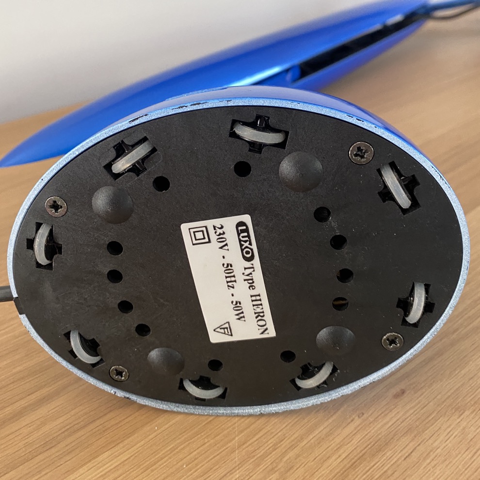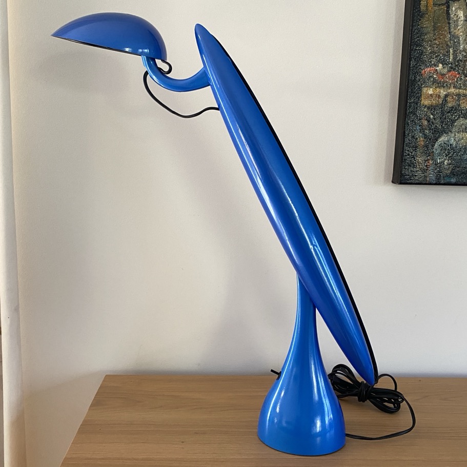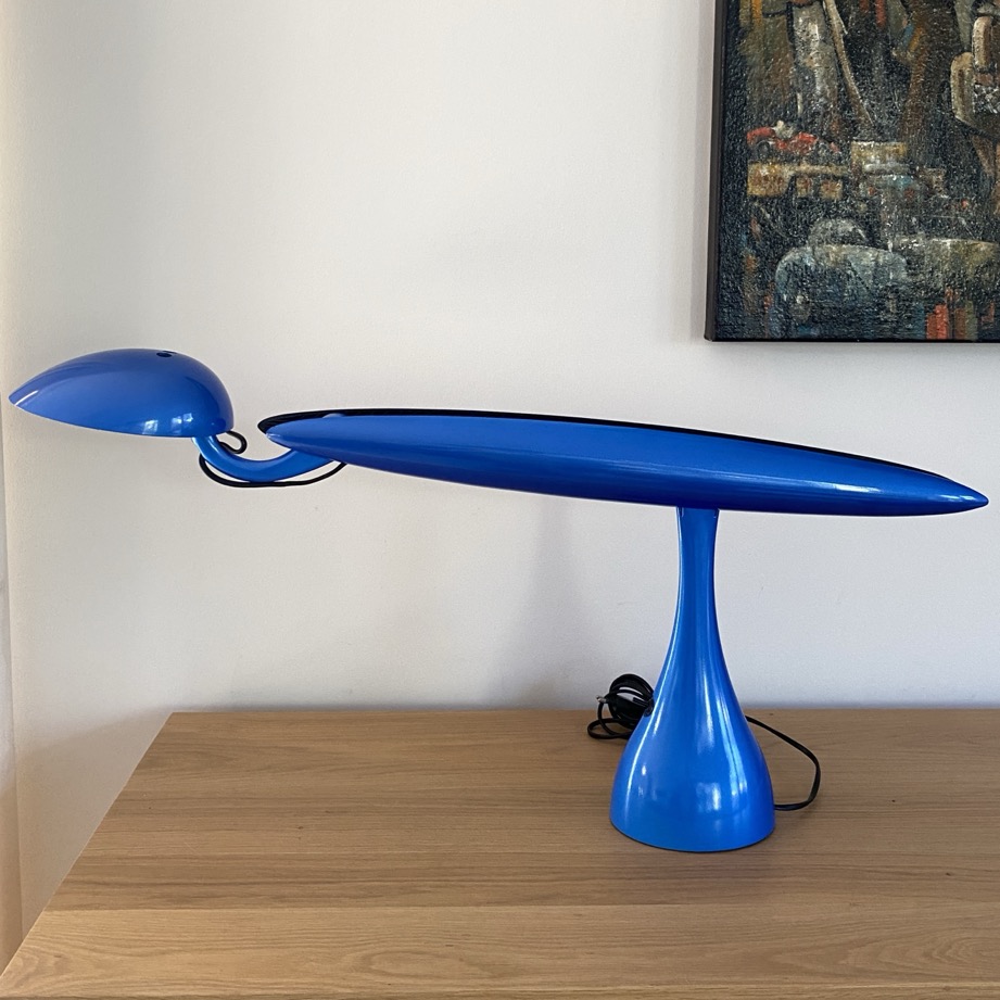 Lampe de bureau (68 cm de haut) créée par Isao Hosoe (1942-2015) pour Luxo (Oslo/Norvège) en 1994. Elle possède un interrupteur à deux positions et peut tourner sur son axe grâce à 8 petites roulettes sous la base. Le « corps » de cette lampe « Héron » pivote tout en laissant la position de la « tête » à l’horizontale. Elle est en parfait état.