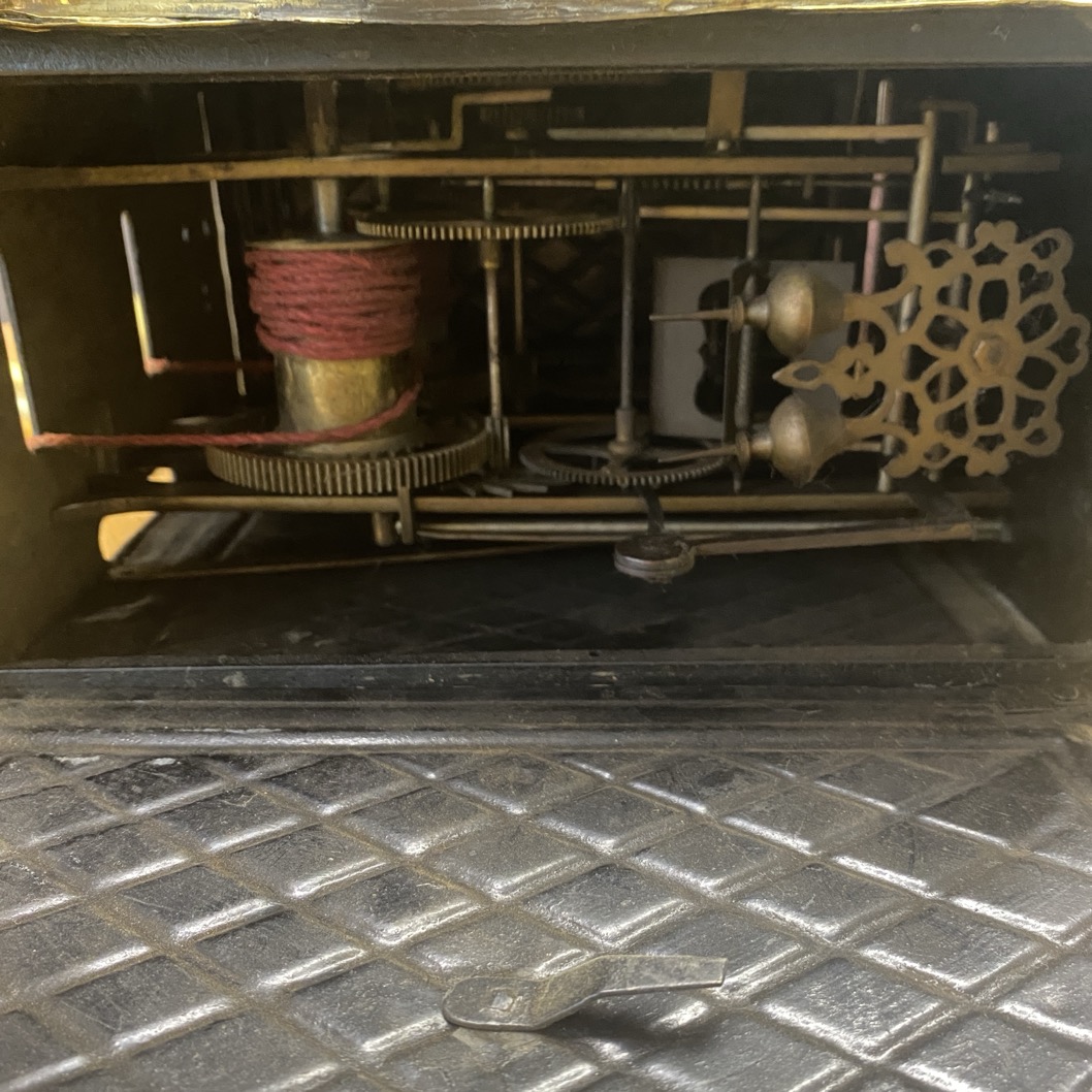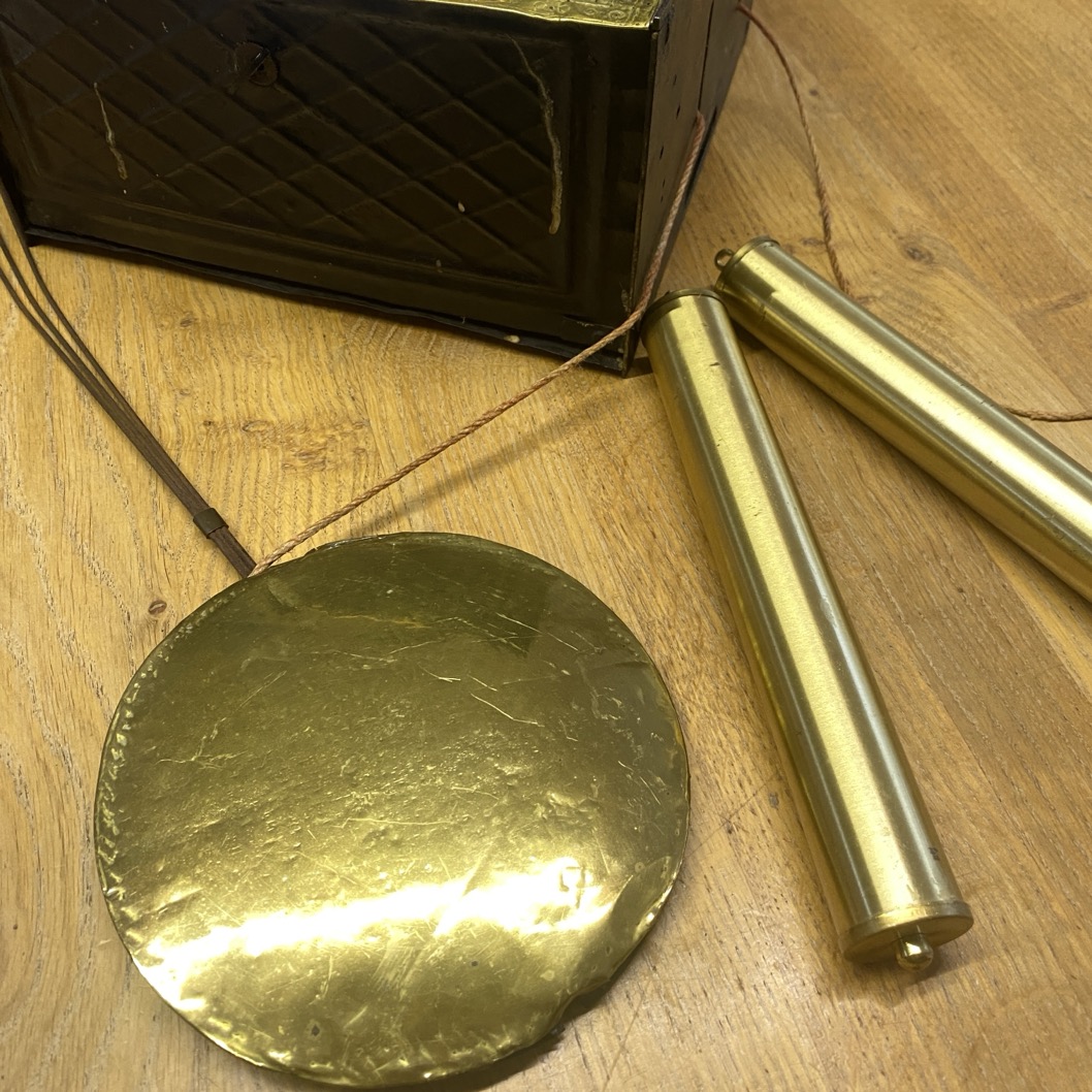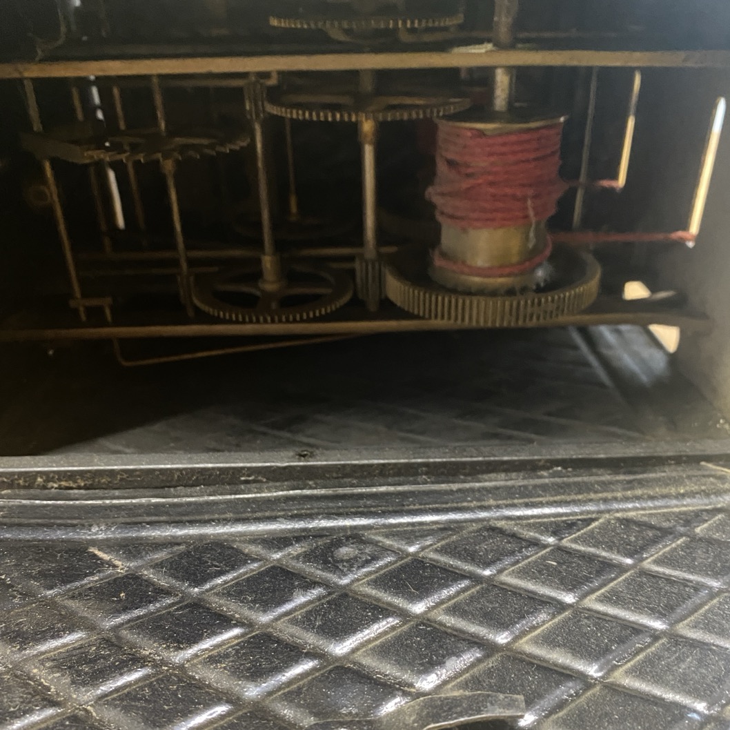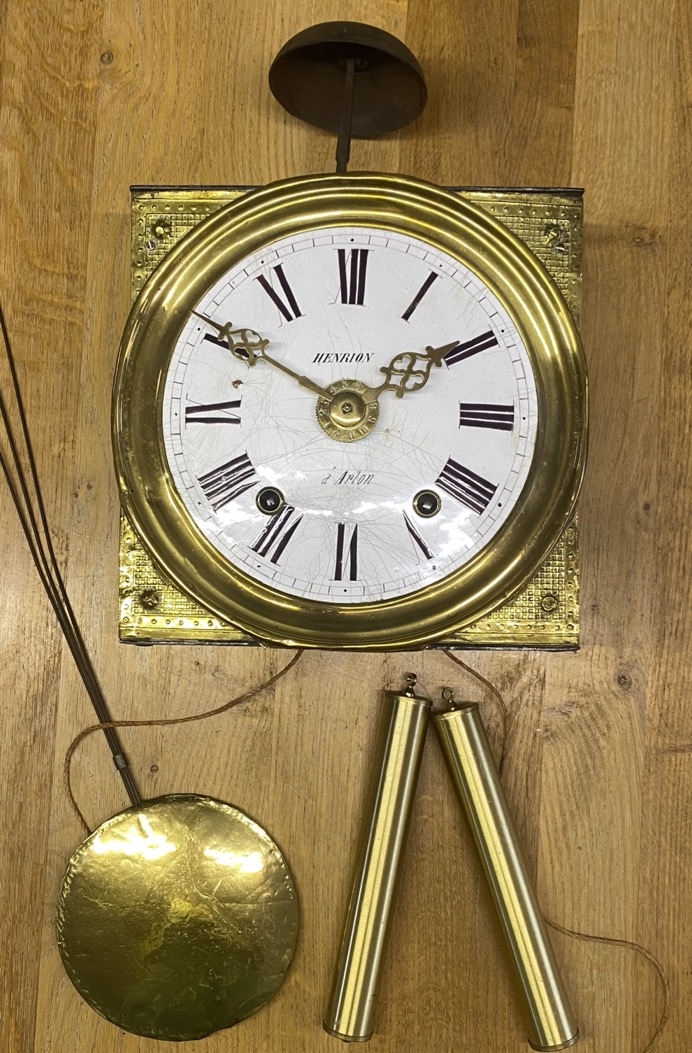Mécanisme d’horloge de parquet, avec cadran en émail marqué Henrion à Arlon. Ce mécanisme date sans doute de la fin du 19è au début du 20è siècle.