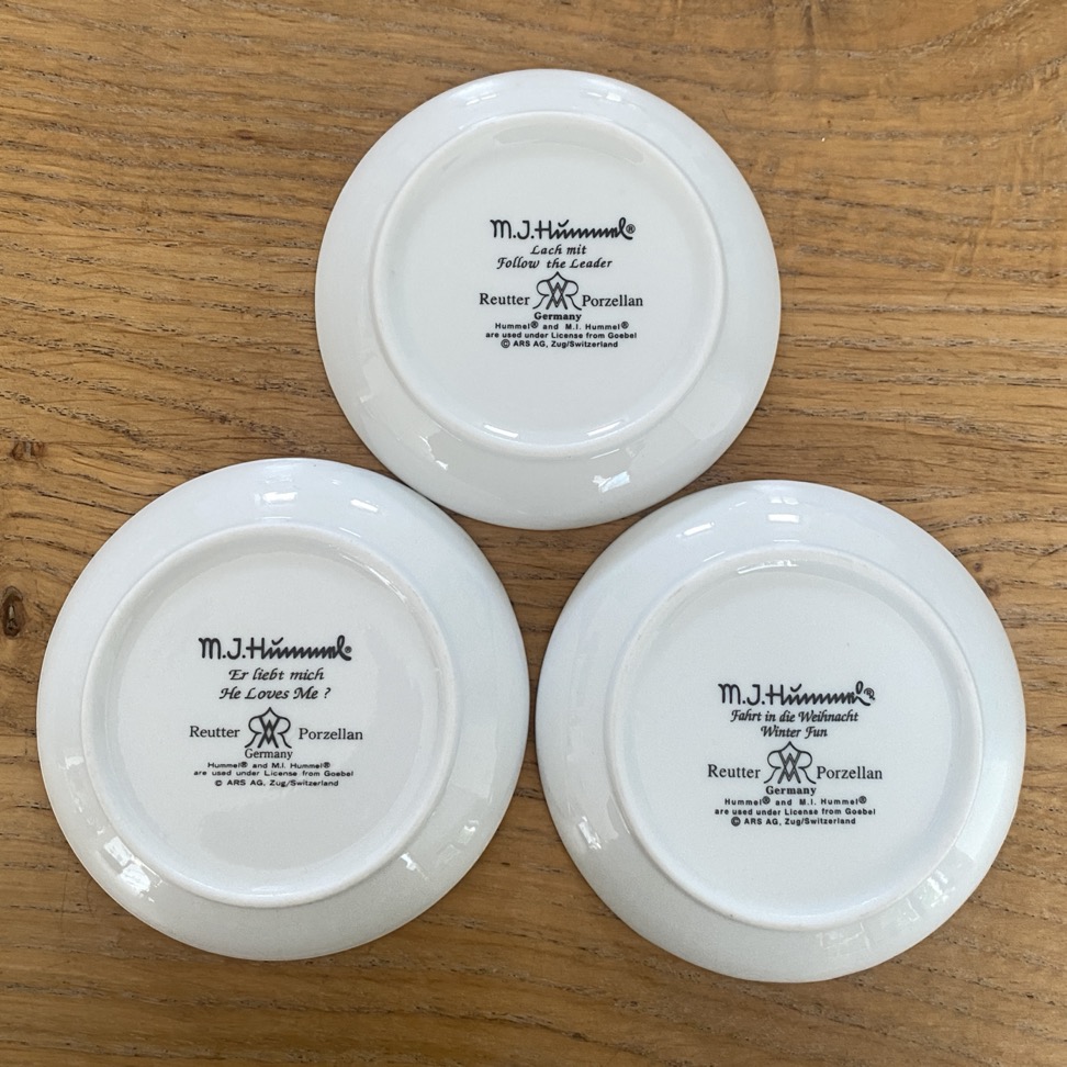 Petites assiettes (9,5 cm de diamètre) portant des illustrations de MJ Hummel (Soeur Maria Innocentia Hummel), produites par Reutter Porzellan. 3 motifs différents au prisx de 15€ l’assiette.