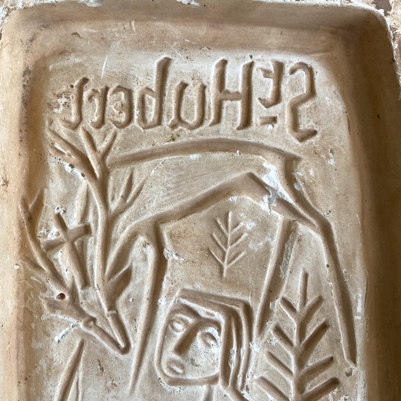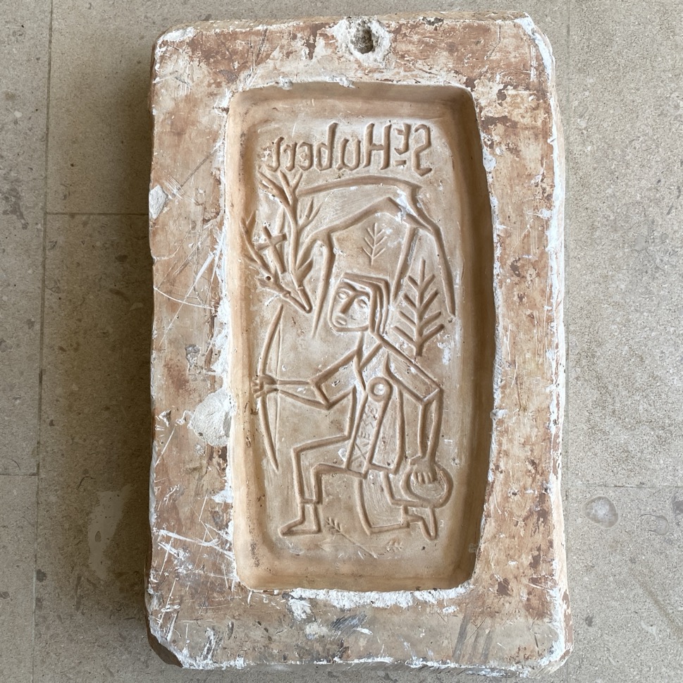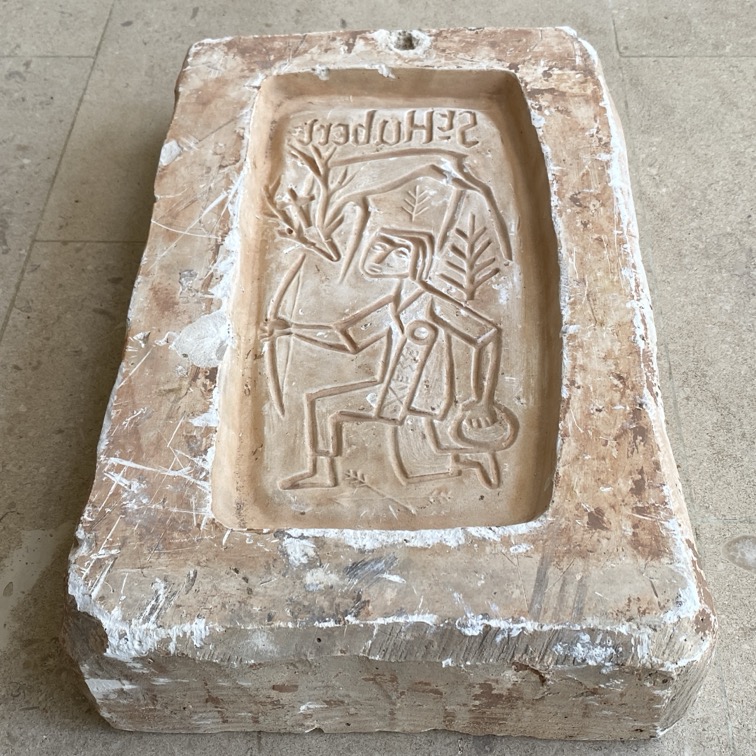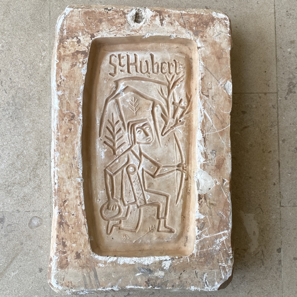 Moule en plâtre (44×27) pour mouler une plaque de céramique (33×17 cm de surface utile) portant une représentation stylisée de Saint Hubert.
