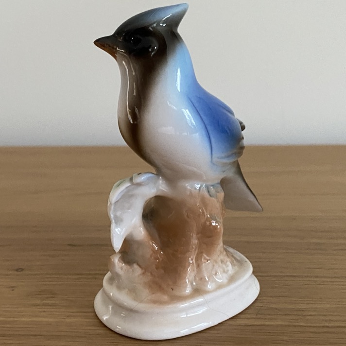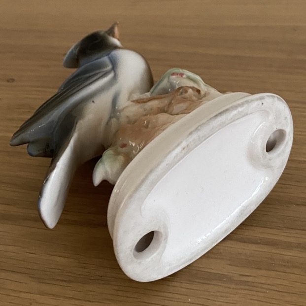 Petit oiseau en faïence (11 cm de haut) dans le style de Goebel. Cette petite sculpture n’est pas marquée ni signée.
