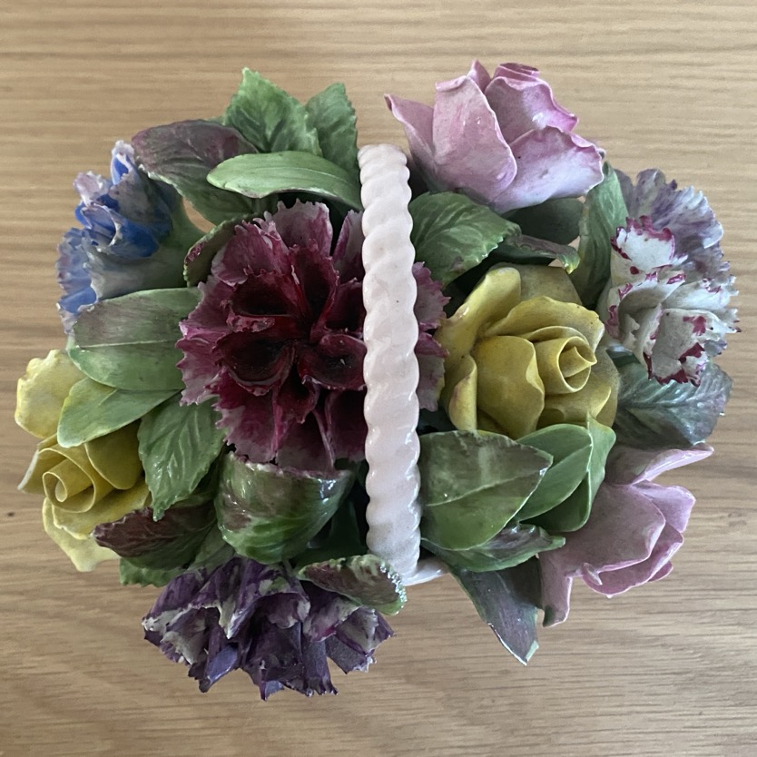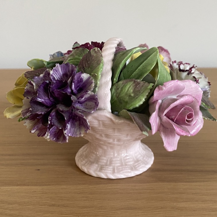 Petit panier de fleurs en porcelaine (14 cm de long), produit par la manufacture Royal Adderley en Angleterre et portant le numéro de forme FB27. Elle est dans un état correct.
