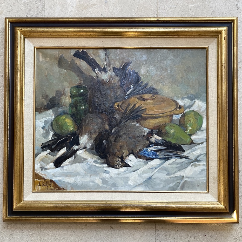 Peinture à l’huile sur toile (70×80 cadre compris) d’une Natture morte avec oiseaux, signée en bas à gauche YV Lichtfus. Cette Nature morte est paradoxalement très vivante et est tres joliment encadrée. Yvette Lichtfus (Arlon 1925-Ixelles 2014), apprit la peinture chez le peintre De Wit, ainsi qu’à l’académie des Beaux-Arts de Bruxelles. L’essentiel pour elle est de capter la lumière, de laisser chanter les couleurs, avec une palette de tons chauds. Même si elle ne se revendique d’aucune école, ses oeuvres tendent vers un impressionnisme lumineux.