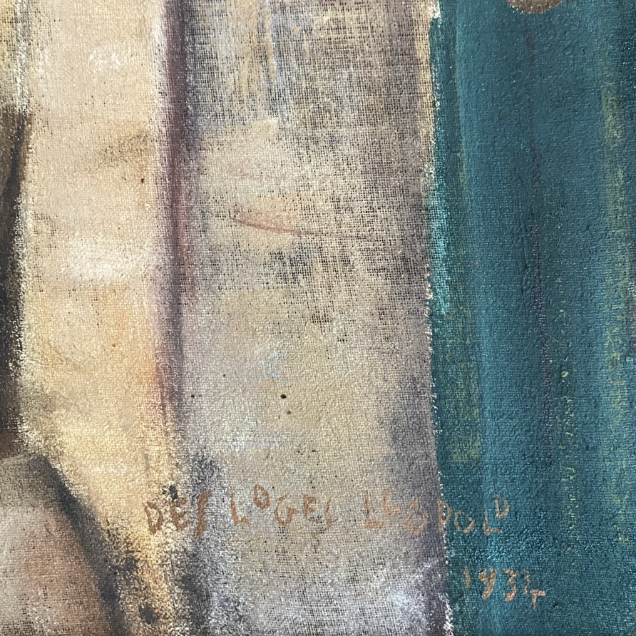 Peinture à l’huile (119×72 cm) représentant « La retraite des Allemands à Cortenberg » (titre à l’arrière), signée en bas à droite Desloges Léopold 1934. Léopold Desloge (Popol) est un artiste arlonais qui y a vécu, travaillé et dessiné à Arlon (Arlon 1912-Arlon 2020). Il a essentiellement peint et esquissé sa ville d’Arlon. Léopold Desloges était peintre en bâtiment et avait son magasin à la Grand Place, il était également artiste. Il a participé à une expo rétrospective en 2006 à La Clairière.