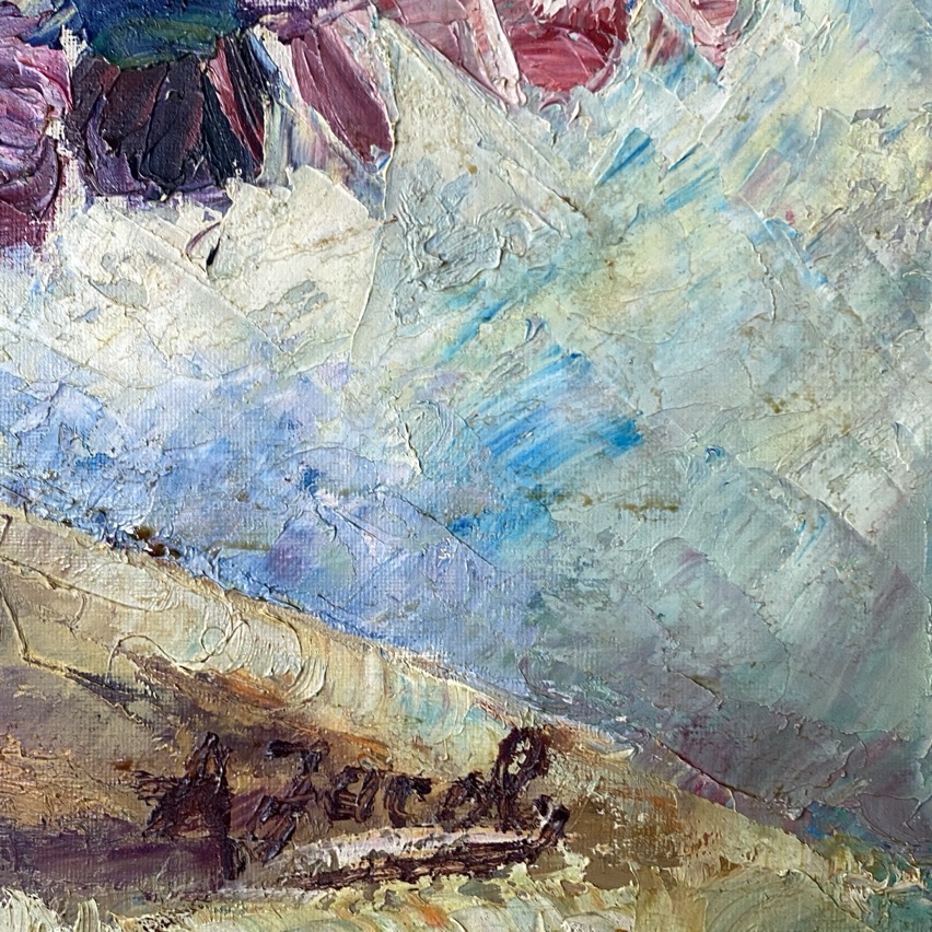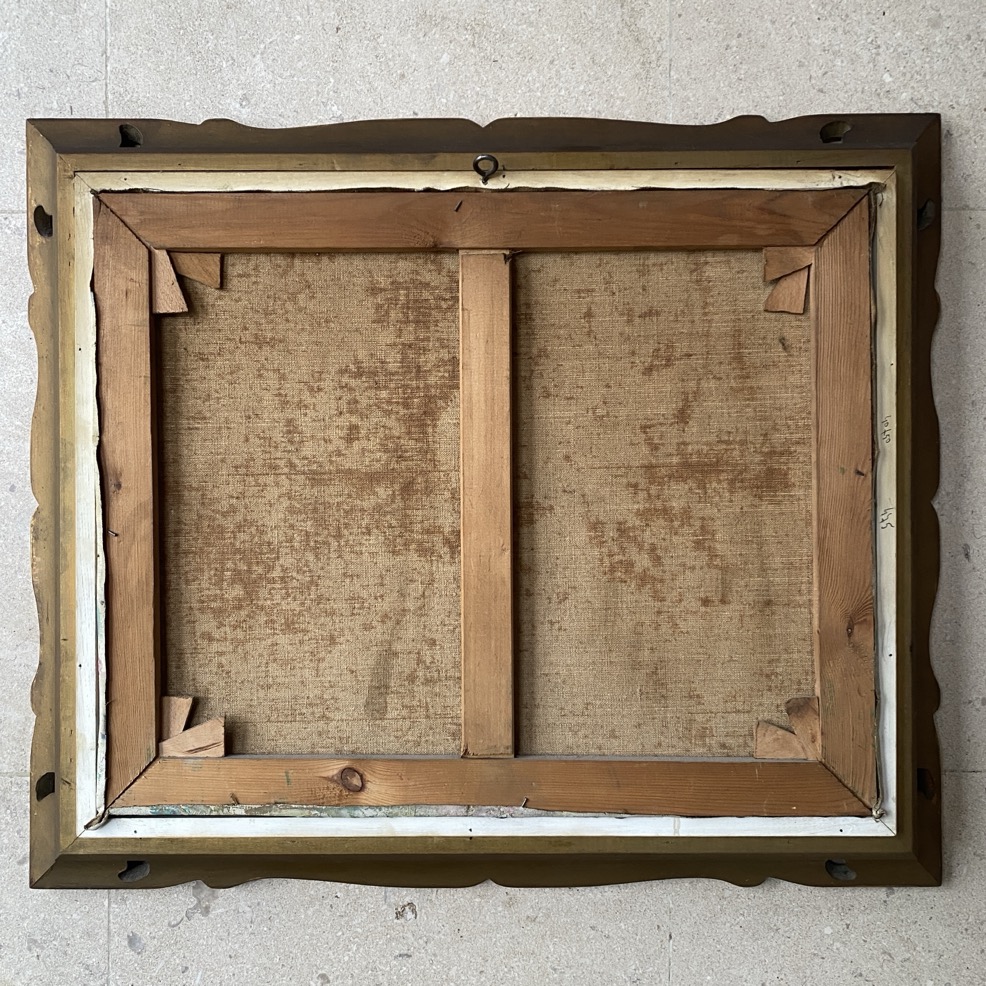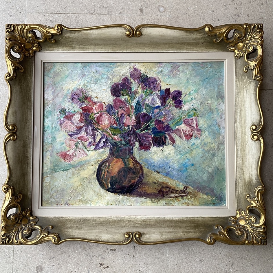 Peinture à l’huile (64×54 cm cadre compris) représentant un bouquet de fleurs, signée en bas à droite A Jacob. Alexandrine Jacob est une artiste arlonaise qui très jeune, elle est attirée par la peinture et commence à peintre à 18 ans au Couvent des Chanoinesses. Elle suit des cours de l’Académie des Beaux-Arts de Bruxelles. Appréciée pour ses peintures de fleurs, on la surnomma trop souvent à son gré « le peintre des fleurs ». Elle aimait également les chevaux de labour, la moisson, la terre. Elle adorait travailler au couteau, en pleine pâte, dans des coloris somptueux. Elle était également une pastelliste de talent, d’une sensibilité délicate, et une portraitiste perspicace. Dès la fin des années 1940, elle peint également des marines qui, selon un article de 1950, « dépassent de loin ses tableaux de fleurs, avec des couleurs attrayantes et sures. Les paysages méditerranéens trouvent en elle une interprète sensible aux lumières et aux teintes éclatantes. Elle atteint ici la vérité picturale avec une pointe de romantisme qui a bien son charme. »