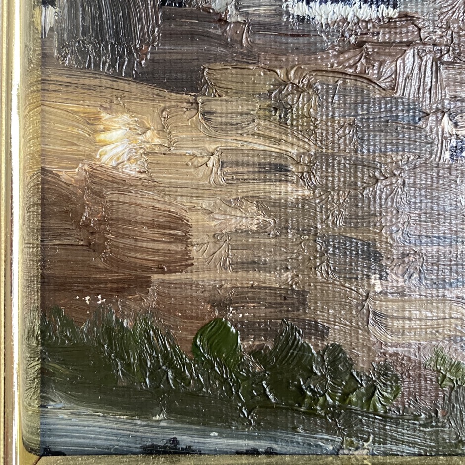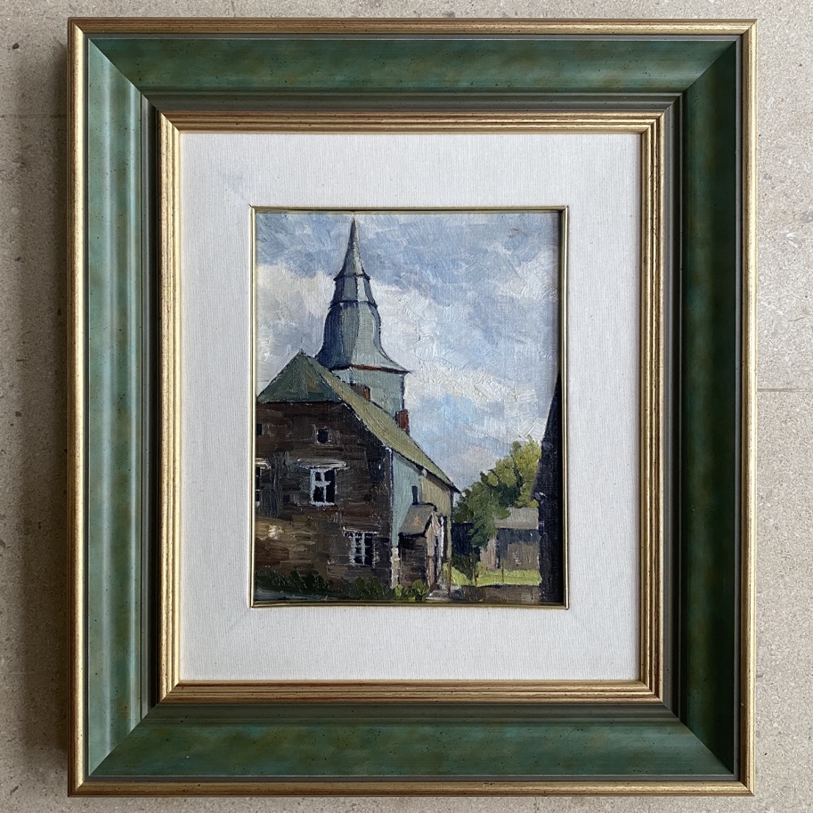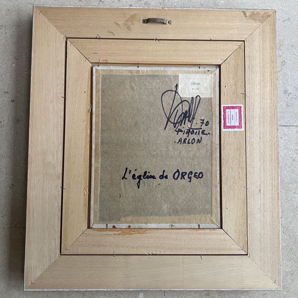 Belle peinture (47x53cm cadre compris) intitulée « L’église d’Orgéo », réalisée par Jules Pirotte (Sainte-Cécile 1922 – Attert 2009) qui vivait et travaillait à Arlon. La peinture est signée en bas à gauche mais elle est cachée par l’encadrement. Elle est également contre-signée et datée 1970.