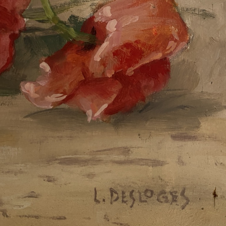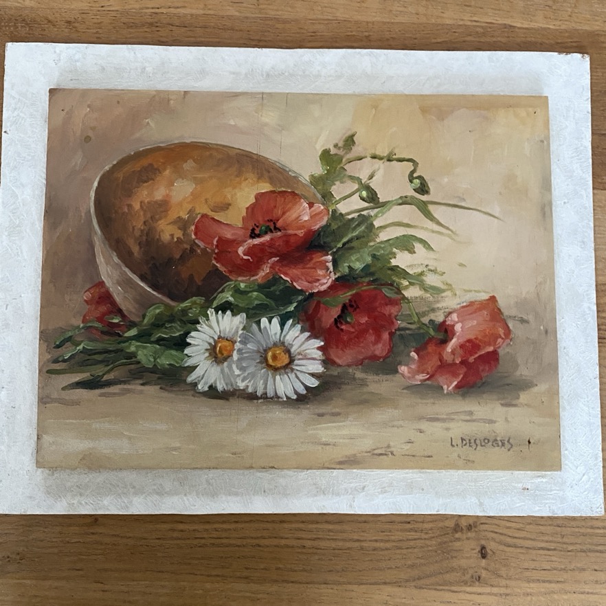 Peinture acrylique sur panneau (35×26 cm hors cadre) portant une représentation de fleurs (coquelicots et marguerites). Elle est signée en bas à droite L. Deslosges. Léopold Desloge (Popol) est un artiste arlonais qui y a vécu, travaillé et dessiné à Arlon (Arlon 1912-Arlon 2020). Il a essentiellement peint et esquissé sa ville d’Arlon. Léopold Desloges était peintre en bâtiment et avait son magasin à la Grand Place, il était également artiste. Il a participé à une expo rétrospective en 2006 à La Clairière.