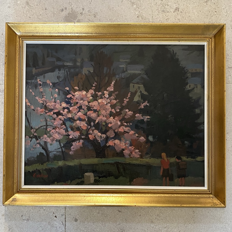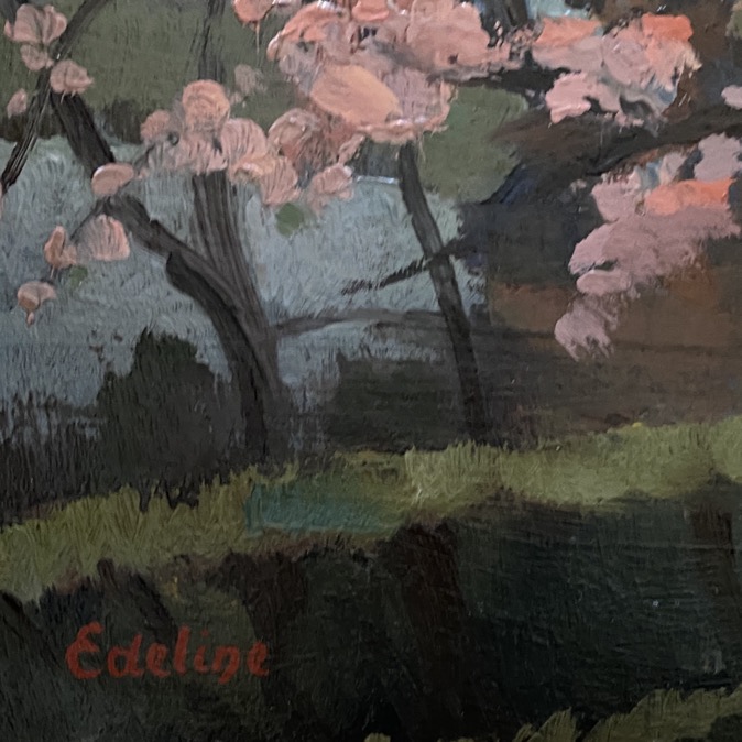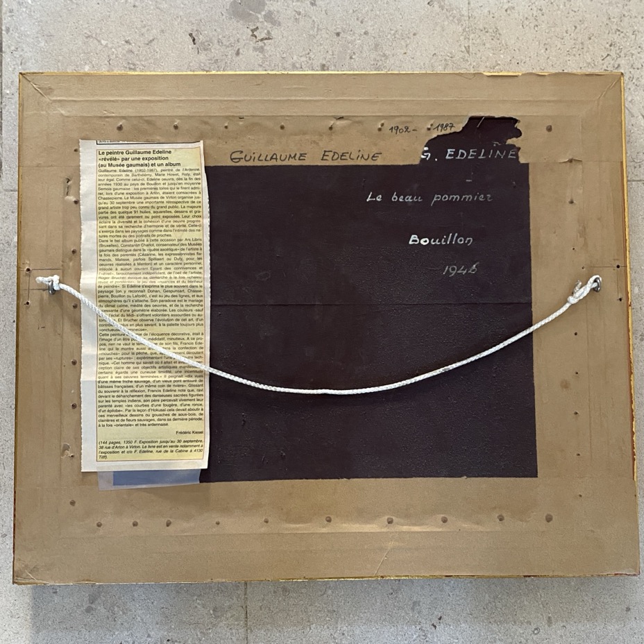 Peinture à l’huile sur panneau (49×41 cm cadre compris) intitulée « Le beau Pommier, Bouillon » signée en bas à gauche « Edeline » et dat&ée au verso de 1946. Guillaume Edeline (1902-1987) est un peintre de l’école de Vresse. Peintre de paysages, de portraits, de natures mortes et de fleurs, aquarelliste, graveur, il a aprris son art à l’académie royale des beaux-arts de Bruxelles, entre autres. Professeur de dessin aux athénées de Chimay, Ixelles et Bouillon, il rencontre C. Counhaye, H. Wolvens, M. Howet et A. Raty et est membre de l’Académie luxembourgeoise. A partir de 1934, il participe à de très nombreuses expositions personnelles et collectives en Belgique et à l’étranger. L’expressionnisme flamand et le cubisme français influencent ses paysages (vallée de la Meuse, de la Semois…), ses vues de villes (Bouillon, Neufchâteau…), très architecturées; R. Brucher qualifie son art de « constructivisme expressionniste ».