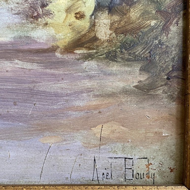 Belle peinture à l’huile sur panneau (45×37 cm cadre compris) signé en bas à droite « Noël Boudy ». Noël Boudy (1864-1902) est un artiste français (Corrèze), élève d’Auguste Hiolle et de JL Gérôme. membre de la Société des Artistes Français, il exposa régulièrement au salon de 1888 à 1896.