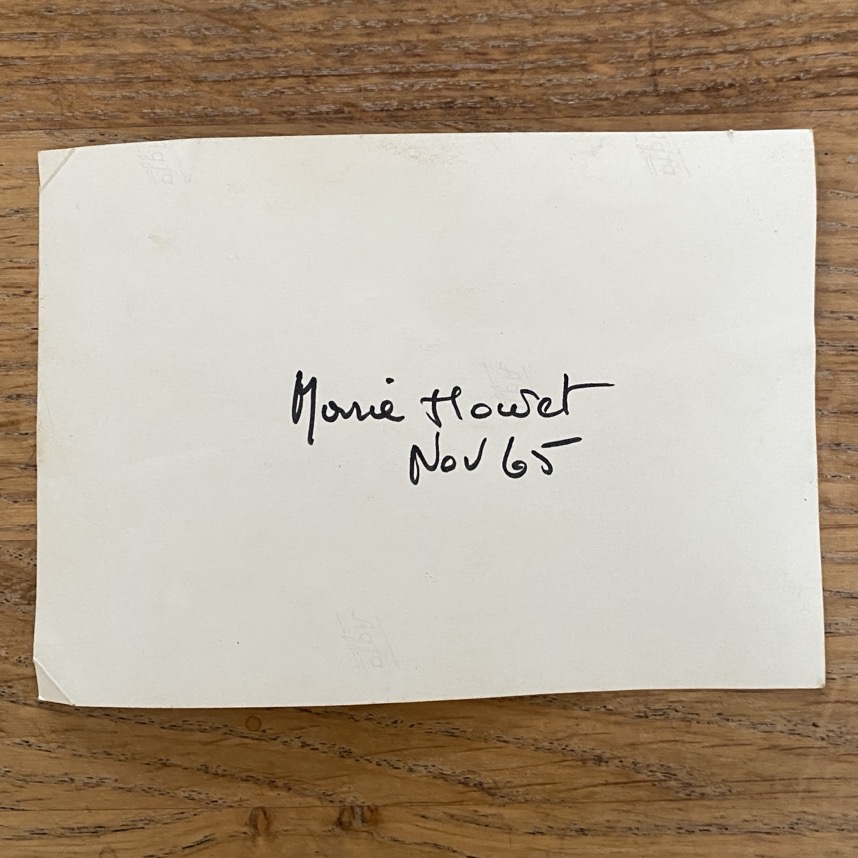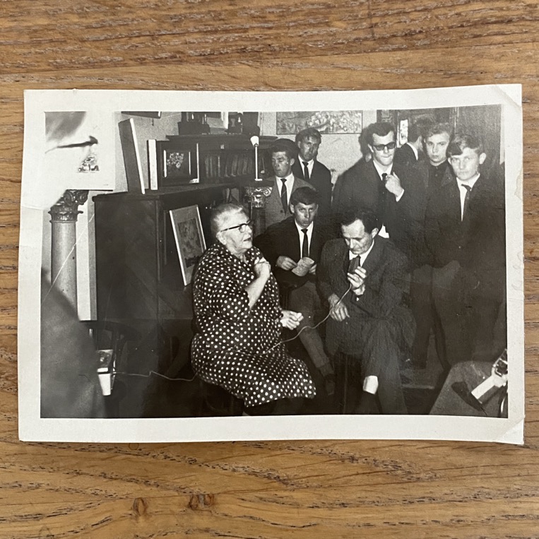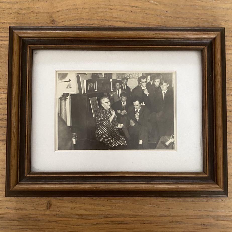 Photographie (12×8 cm sans cadre) de Marie Howet entourée d’élèves de l’Ecole Normale de Virton. Elle est datée au verso de novembre 1965. La scène se passe sans doute chez Marie Howet.