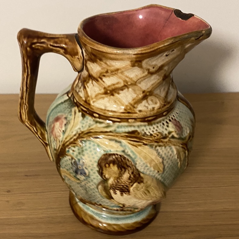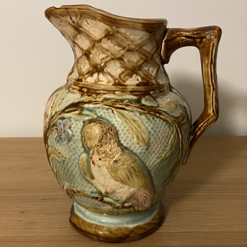 Pichet en barbotine « Perroquets », Mouzin Lecat, Nimy lez Mons 1870