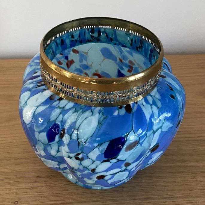 Joli pique-fleurs (14 cm de haut) en verre avec anneau en laiton. Ce « vase » en verre moucheté style confettis est sans doute une production tchèque durant la période Art Déco (1930-1940). Il s’agit sans doute d’une production de la manufacture Wilhelm Kralik Sohn (1881-1940).
