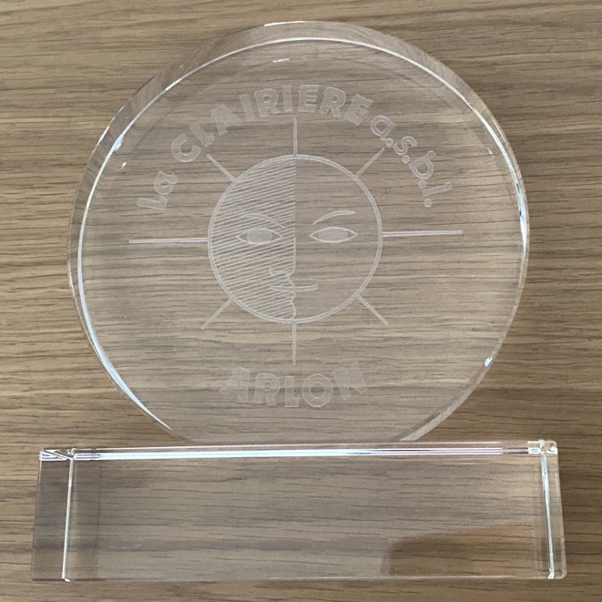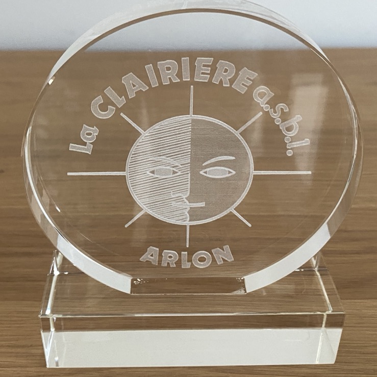 Souvenir commémoratif en verre (14,5 x 12 cm) en souvenir de La Clairière à Arlon. Il est en parfait état.