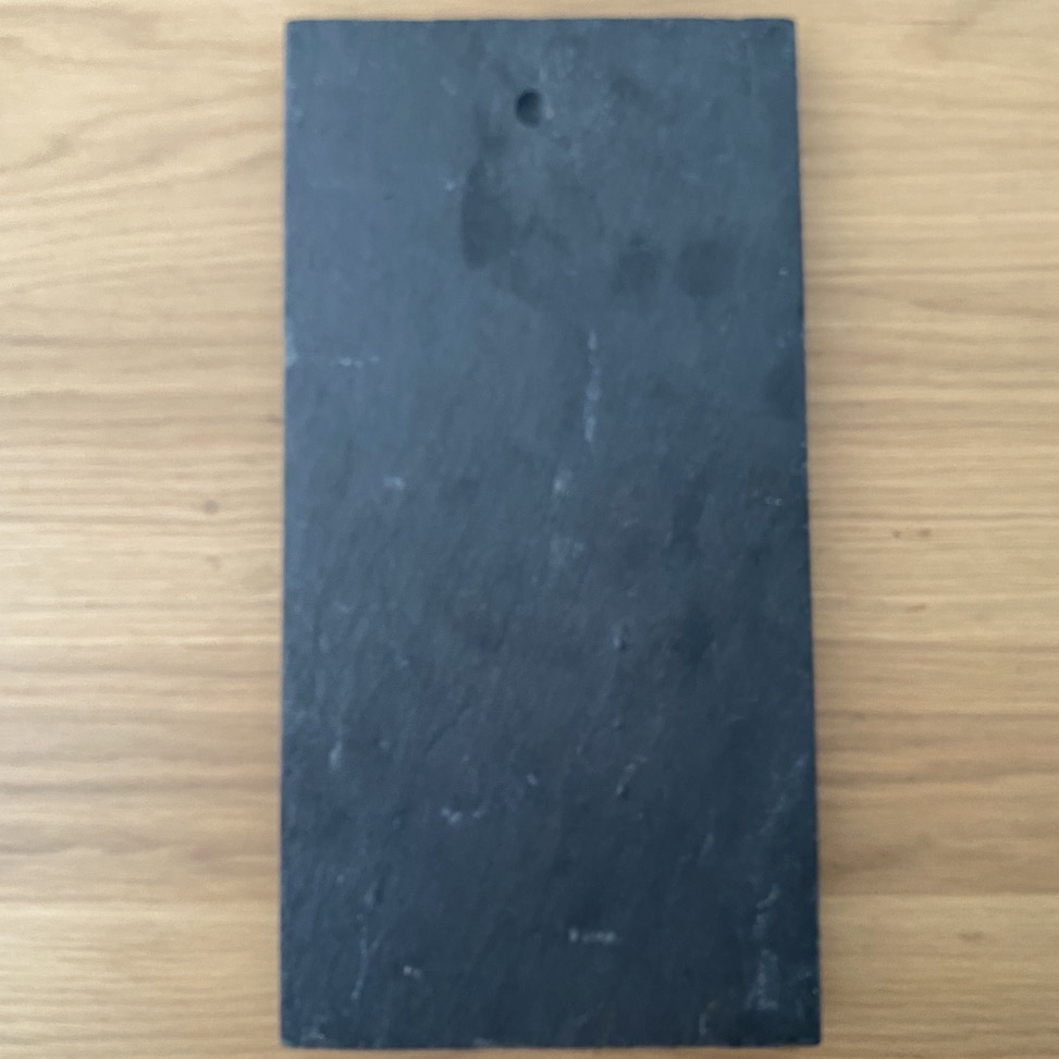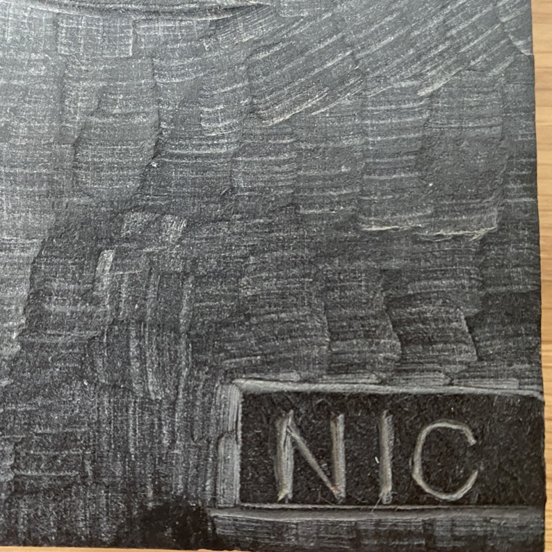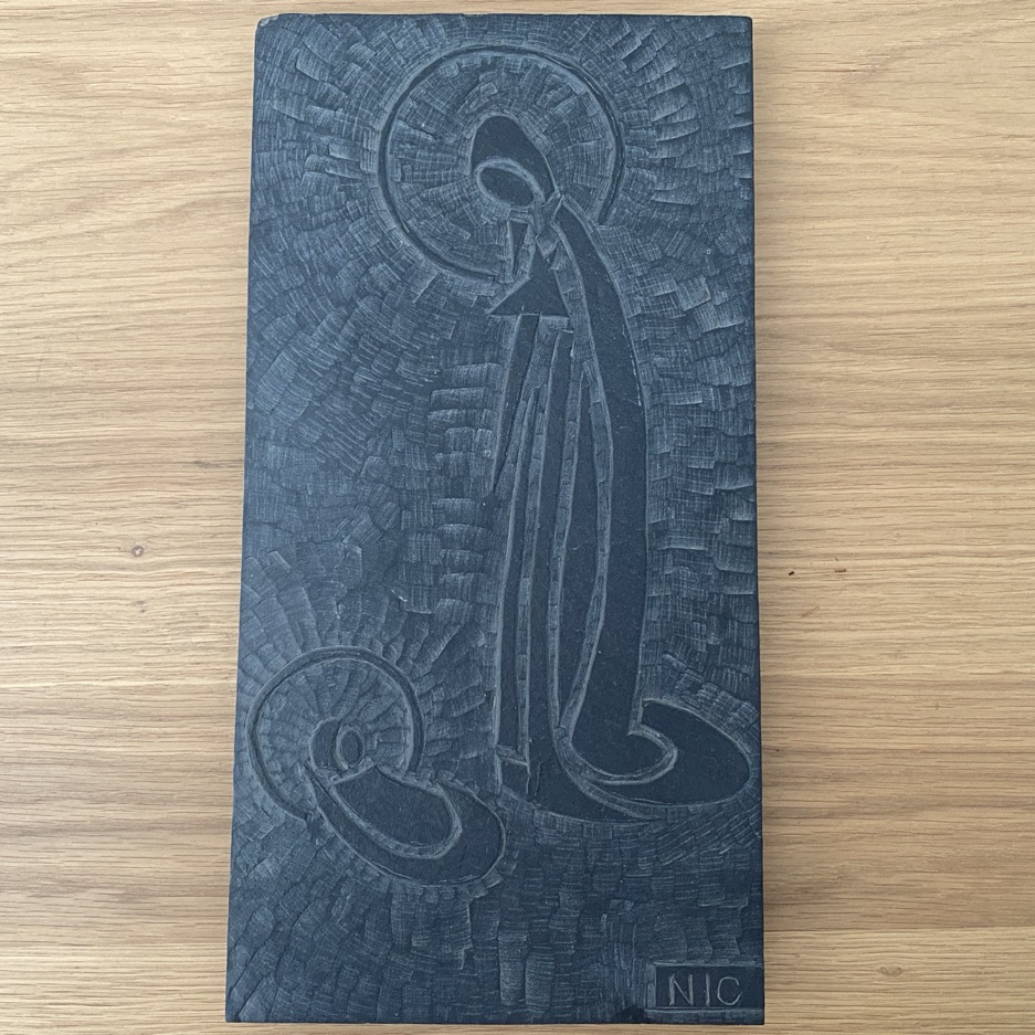 Belle plaque en schiste sans doute de Martelange (15×29 cm) prtant une représentation gravée de la Vierge avec l’Enfant. Elle est signée en bas à droite « NIC ». L’ariste n’a pas pu être identifié.