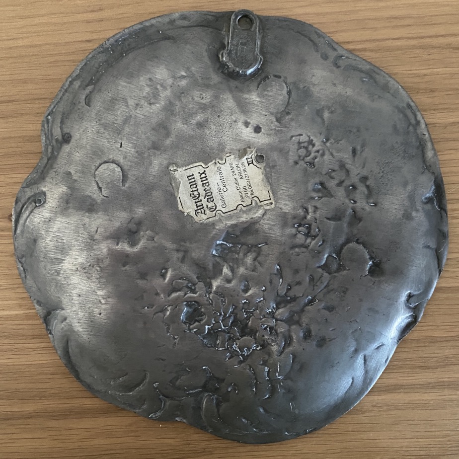 Petite plaque en étain (19 cm de diamètre) portant une représentation d’une fillette au milieu de fleurs. Cette plaque est prévue à être suspendue. Cette plaque date sans doute des années 1980 et a été achetée chez « ArtEtains Cadeaux à Arlon.